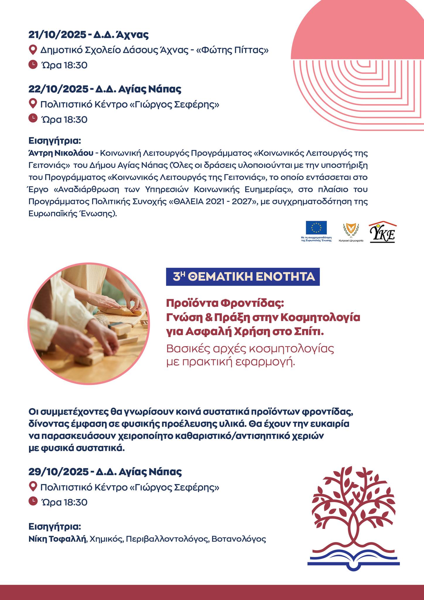 Η τρίτη θεματική ενότητα, «DIY Προϊόντα Φροντίδας: Γνώση & Πράξη στην Κοσμητολογία για Ασφαλή Χρήση στο Σπίτι», παρουσιάζει τις βασικές αρχές κοσμητολογίας με πρακτική εφαρμογή. Οι συμμετέχοντες θα γνωρίσουν κοινά συστατικά προϊόντων φροντίδας, δίνοντας έμφαση σε φυσικής προέλευσης υλικά, και θα παρασκευάσουν χειροποίητο καθαριστικό/αντισηπτικό χεριών. Η δράση θα πραγματοποιηθεί την Τρίτη 29 Οκτωβρίου 2025, στο Πολιτιστικό Κέντρο Αγίας Νάπας «Γιώργος Σεφέρης», στις 18:30, υπό την καθοδήγηση της Νίκης Τοφαλλή, Χημικού, Περιβαλλοντολόγου και Βοτανολόγου.
