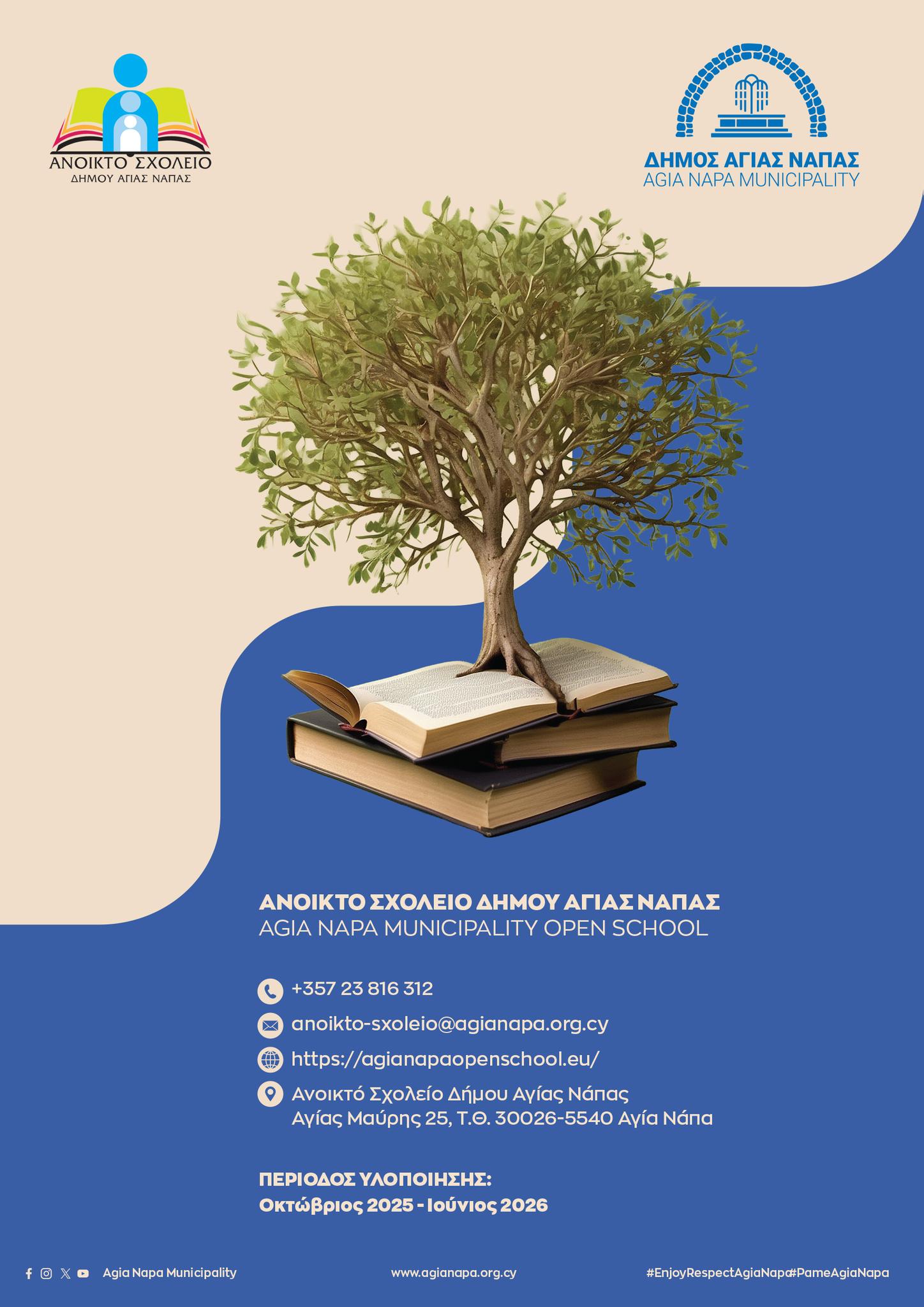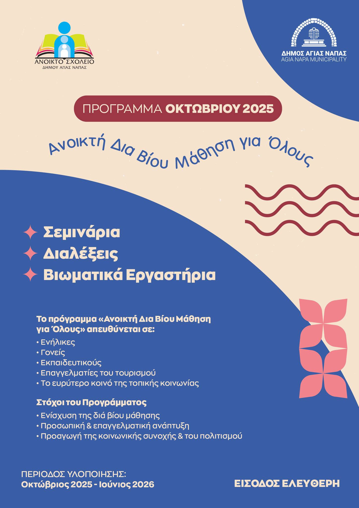 Ο Δήμος Αγίας Νάπας, μέσω του θεσμού του Ανοικτού Σχολείου, εγκαινιάζει το νέο πρόγραμμα «Ανοικτή Δια Βίου Μάθηση για Όλους: Σεμινάρια – Διαλέξεις – Βιωματικά Εργαστήρια», που απευθύνεται σε ενήλικες, γονείς, εκπαιδευτικούς, επαγγελματίες του τουρισμού και στο ευρύτερο κοινό της τοπικής κοινωνίας.