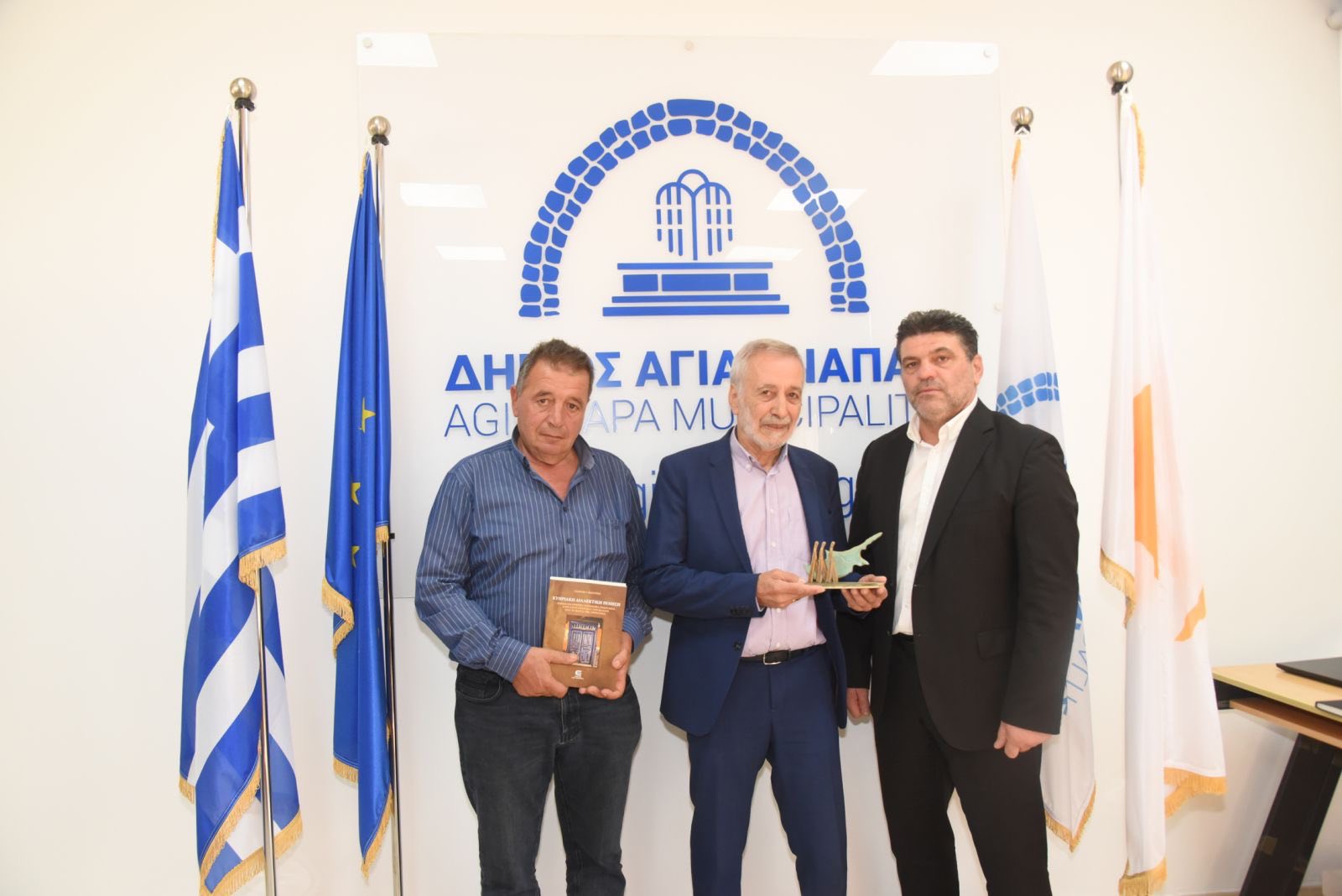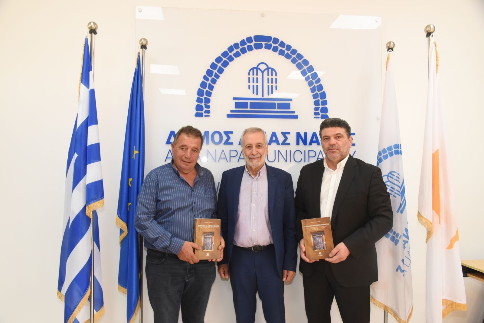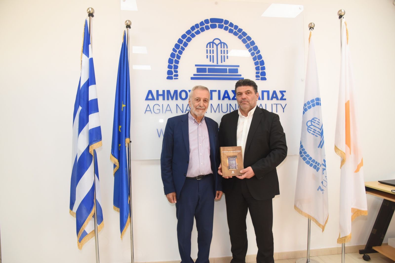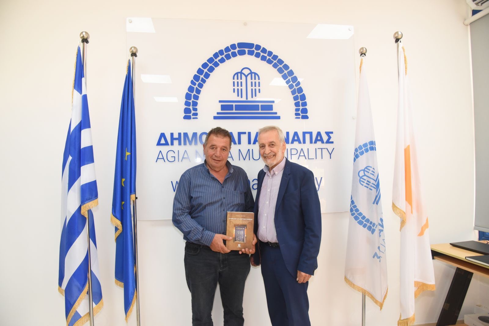 Ο Δήμαρχος Αγίας Νάπας κ. Χρίστος Ζαννέττου δέχθηκε την Παρασκευή 14 Νοεμβρίου στο γραφείο του τον κ. Γιώργο Φλουρή, ο οποίος, εντυπωσιασμένος από την πλούσια πολιτιστική δραστηριότητα του Δήμου, επισκέφθηκε τον Δήμαρχο προκειμένου να του προσφέρει ως δώρο το βιβλίο του με τίτλο «Κυπριακή Διαλεκτική Ποίηση», το οποίο εξέδωσε πέρσι.