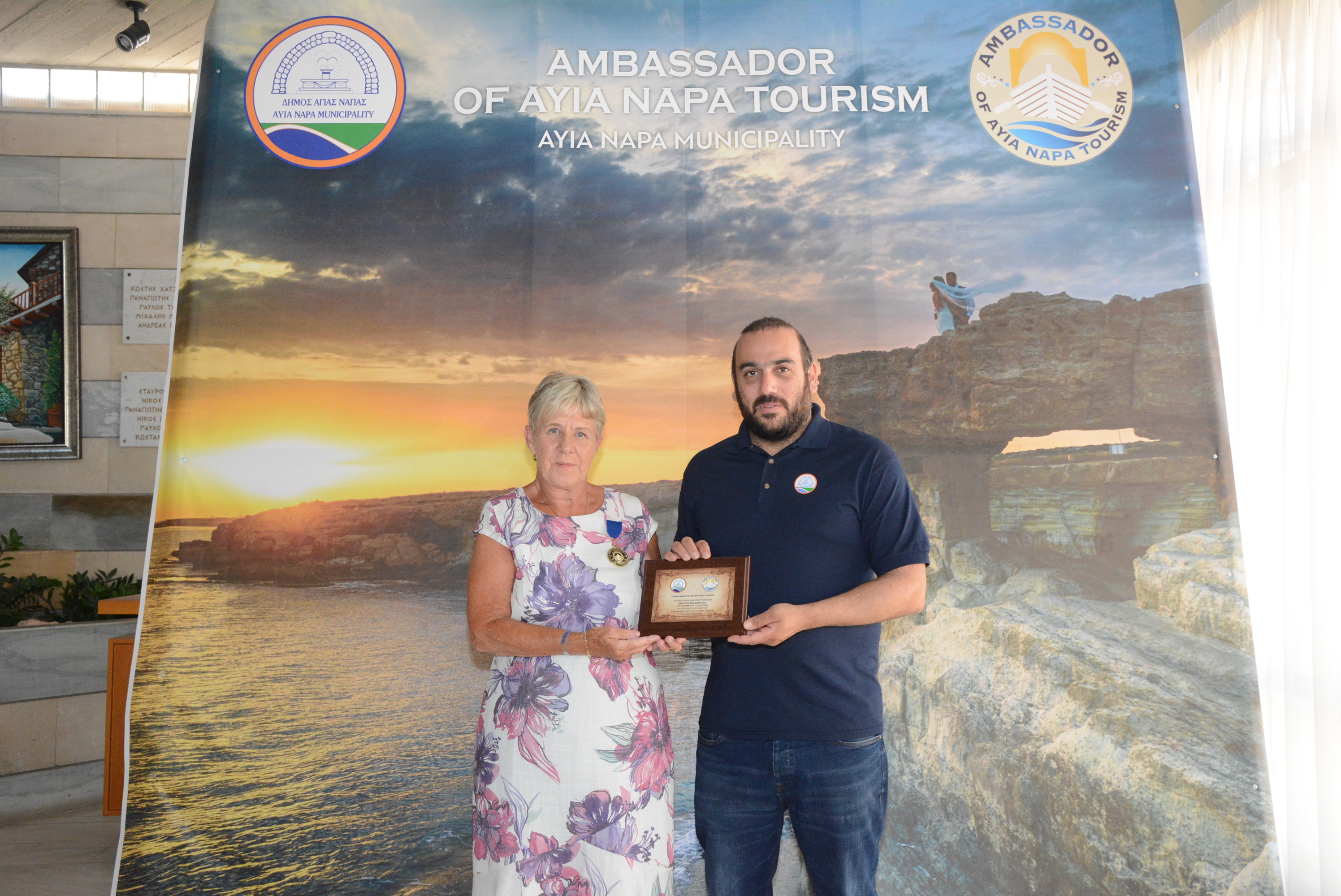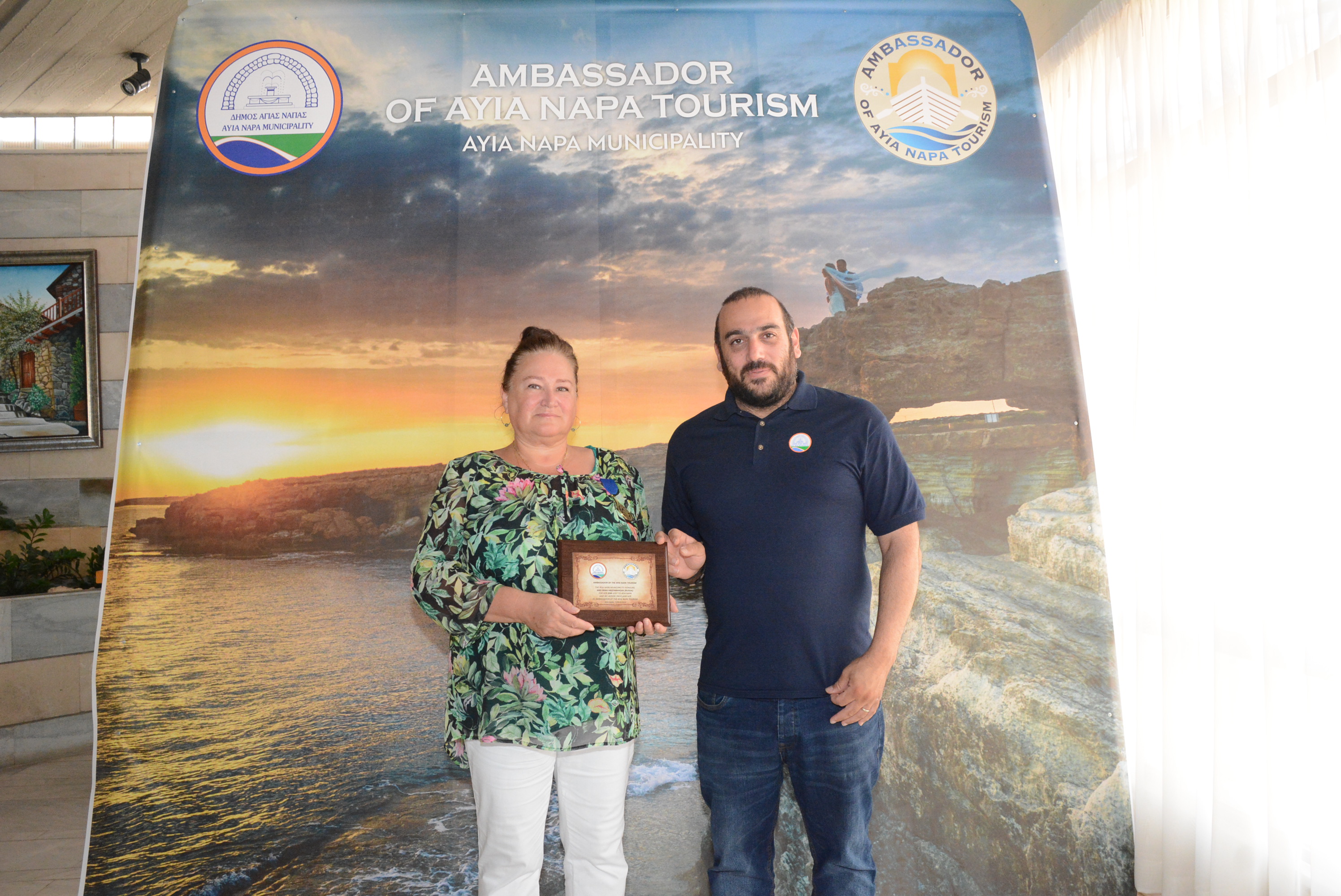 Απονέμοντας την αναμνηστική πλακέτα και το έμβλημα του «Πρέσβη του Τουρισμού της Αγίας Νάπας, ο κ. Καρούσος ευχαρίστησε τις τακτικές επισκέπτριες για την ιδιαίτερη προτίμησή τους στην Αγία Νάπα, καθώς και για το γεγονός ότι την έχουν καταστήσει πλέον ως τον μόνιμο τουριστικό τους προορισμό.