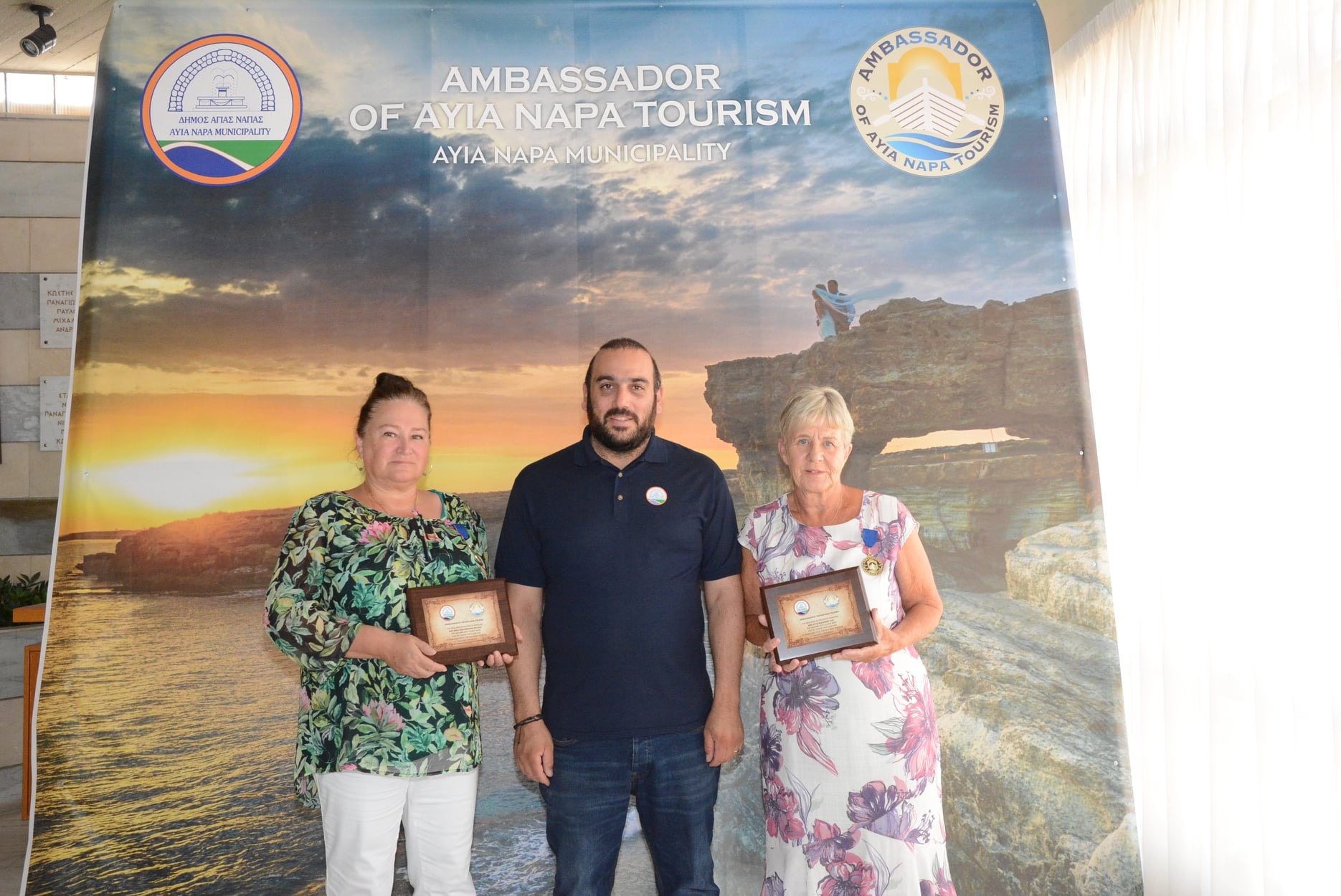 Απονέμοντας την αναμνηστική πλακέτα και το έμβλημα του «Πρέσβη του Τουρισμού της Αγίας Νάπας, ο κ. Καρούσος ευχαρίστησε τις τακτικές επισκέπτριες για την ιδιαίτερη προτίμησή τους στην Αγία Νάπα, καθώς και για το γεγονός ότι την έχουν καταστήσει πλέον ως τον μόνιμο τουριστικό τους προορισμό.