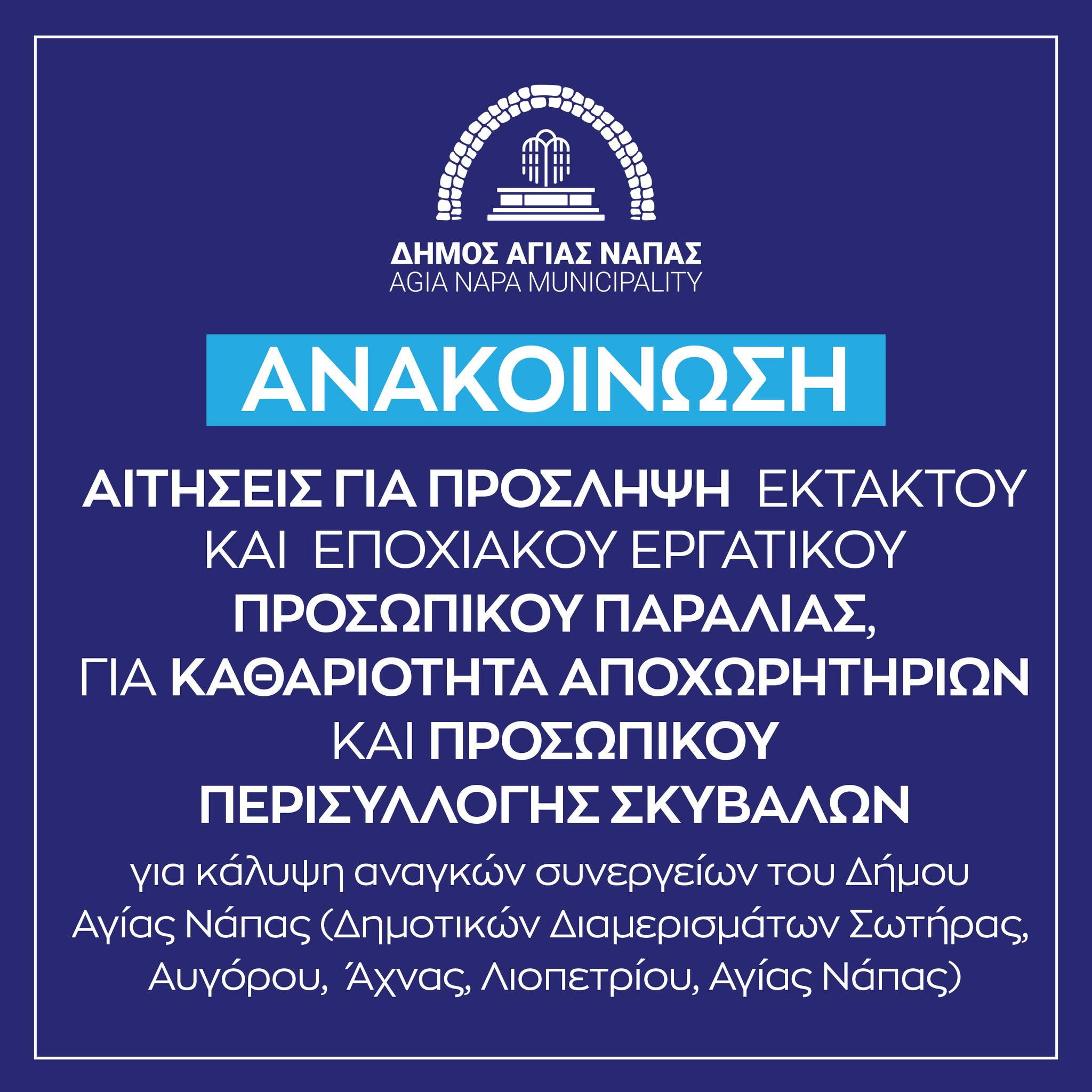 Ο Δήμος Αγίας Νάπας δέχεται αιτήσεις μέχρι την ημέρα Παρασκευή, 28 Νοεμβρίου 2025 και ώρα 12:00 μ.μ., για πρόσληψη του αντίστοιχου αριθμού έκτακτου και εποχιακού εργατικού προσωπικού παραλίας για καθαριότητα αποχωρητηρίων και προσωπικού περισυλλογής σκυβάλων, για κάλυψη αναγκών συνεργείων του Δήμου Αγίας Νάπας (Δημοτικών Διαμερισμάτων Σωτήρας, Αυγόρου, Άχνας, Λιοπετρίου, Αγίας Νάπας), με την αντίστοιχη μισθοδοσία ανά ειδικότητα.