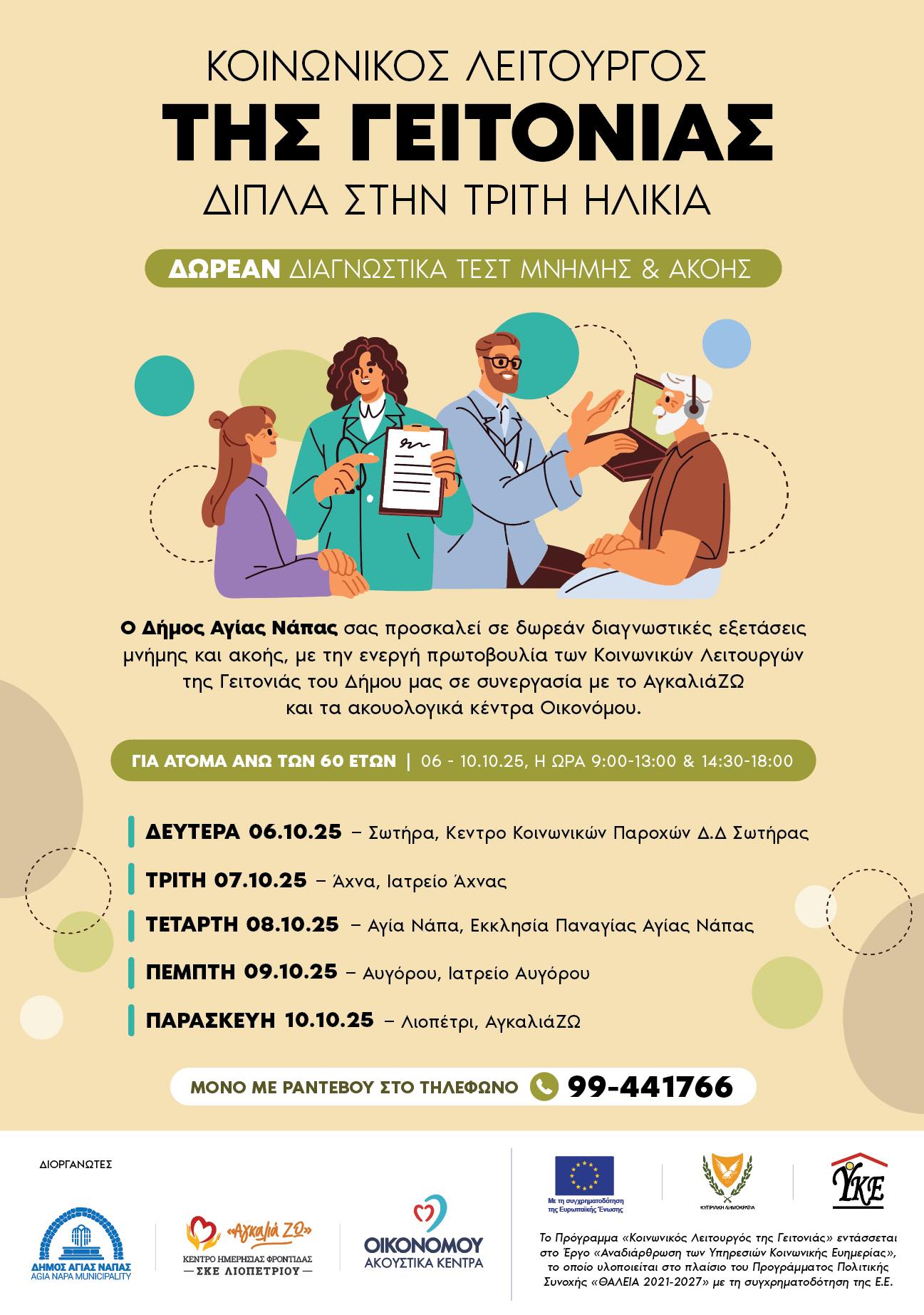 Ο Δήμος Αγίας Νάπας, στο πλαίσιο της δράσης «Κοινωνικός Λειτουργός της Γειτονιάς», ανακοινώνει τη διοργάνωση δωρεάν διαγνωστικών εξετάσεων μνήμης και ακοής για άτομα άνω των 60 ετών.