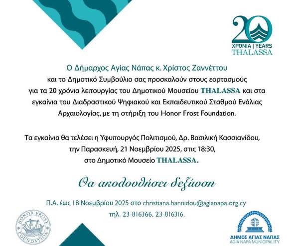 Ο Δήμος Αγίας Νάπας στο πλαίσιο των εορτασμών για τα 20 χρόνια λειτουργίας του Δημοτικού Μουσείου THALASSA, εγκαινιάζει το Διαδραστικό Ψηφιακό και τον Εκπαιδευτικό Σταθμό Ενάλιας Αρχαιολογίας, δύο σημαντικές προσθήκες που υλοποιήθηκαν με την στήριξη του Honor Frost Foundation.