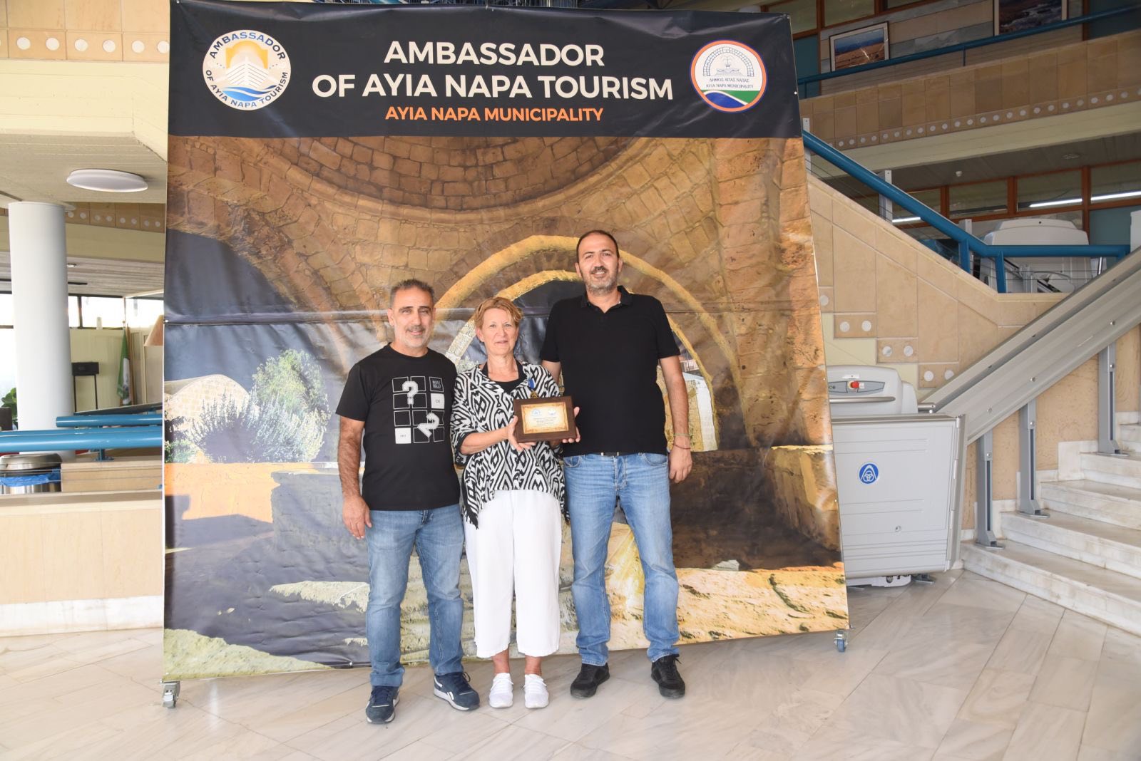 Agia Napa Municipal Council, on behalf of the Mayor, Mr Christos Zannetou. Ms Herzog received a commemorative plaque as well as the emblem of the «Tourism Ambassador».