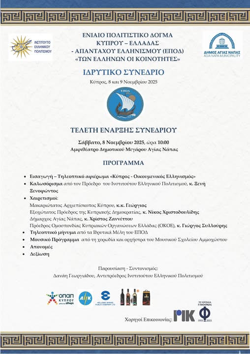Διεξάγεται το Σάββατο, 8 Νοεμβρίου 2025, και ώρα 10:00, στην αίθουσα εκδηλώσεων του Δημοτικού Μεγάρου Αγίας Νάπας, η τελετή έναρξης του Ιδρυτικού Συνεδρίου του Ενιαίου Πολιτιστικού Δόγματος Κύπρου – Ελλάδας – Απανταχού Ελληνισμού (ΕΠΟΔ), «Των Ελλήνων οι Κοινότητες».