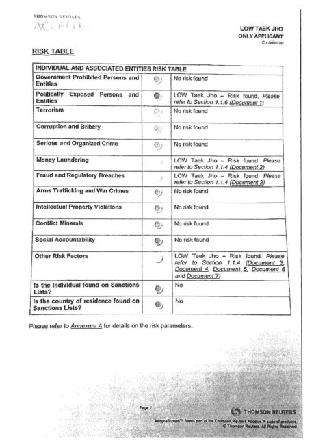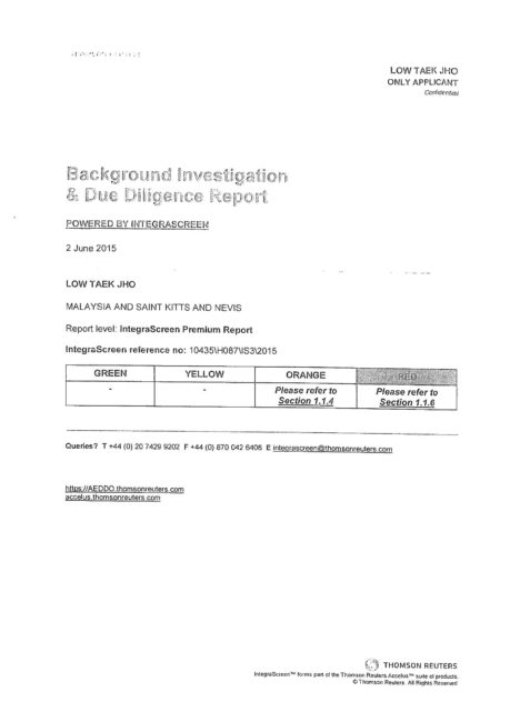 Η Henley & Partners διενήργησε έρευνα για τον Μαλαισιανό επιχειρηματία. Την έρευνα ανέλαβε η Thomson Reuters, την οποία και παρέδωσε στις 2 Ιουνίου 2015. Με βάση τον πίνακα ρίσκου (Risk Table) ο οποίος αποτελείτο από 14 κεφάλαια, ο Τζο Λόου βρέθηκε να έχει πρόβλημα σε 4 από τα 14 κεφάλαια στα οποία διερευνήθηκε. Η έρευνα κατέδειξε α) ότι έχει πρόβλημα ως πολιτικά εκτεθειμένο πρόσωπο β) ότι έχει κατηγορίες εναντίον του για ξέπλυμα βρόμικου χρήματος γ) ότι κατηγορείται για απάτη και παραβίαση χρηματοπιστωτικών κανονισμών και δ) ότι συντρέχουν και μια σειρά άλλοι λόγοι που ενέχουν ρίσκο (other risk factors). Όλα αυτά καταγράφηκαν σε μια έκθεση η οποία ξεπερνούσε τις 100 σελίδες. Με βάση το ρίσκο η έκθεση της Thomson Reuters είχε 4 διαβαθμίσεις σοβαρότητας, ήτοι πράσινη, κίτρινη, πορτοκαλί και κόκκινη. Και οι 4 κατηγορίες στις οποίες βρέθηκε με προβλήματα ο κ. Λόου παρέπεμπαν στο πορτοκαλί και το κόκκινο.