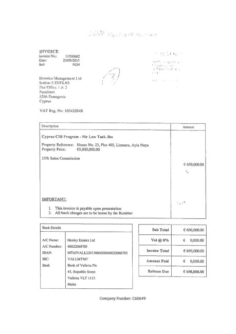 Ο κ. Τζο Λόου ήρθε στην Κύπρο στις 18 Σεπτεμβρίου 2015 και μέσω διαδικασίας εξπρές σε 2 μέρες πήρε κατ’ εξαίρεση το διαβατήριό του από το Υπουργικό Συμβούλιο. Ταυτόχρονα η Henley & Partners στις 23 Σεπτεμβρίου 2015 ενεργώντας εκ μέρους του πελάτη της Τζο Τάεκ Λόου αγόρασε ημιτελή έπαυλη στην περιοχή Λιμνάρα στην Αγία Νάπα έναντι του ποσού των 5 εκατ. ευρώ. Η έπαυλη σύμφωνα με πληροφορίες μας ολοκληρώνεται και θα του παραδοθεί εντός των επόμενων δύο μηνών.
