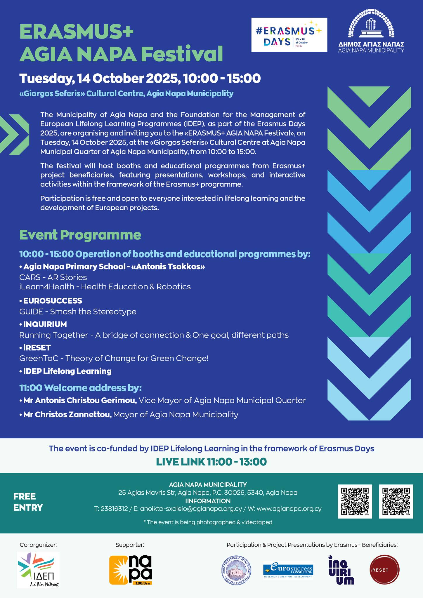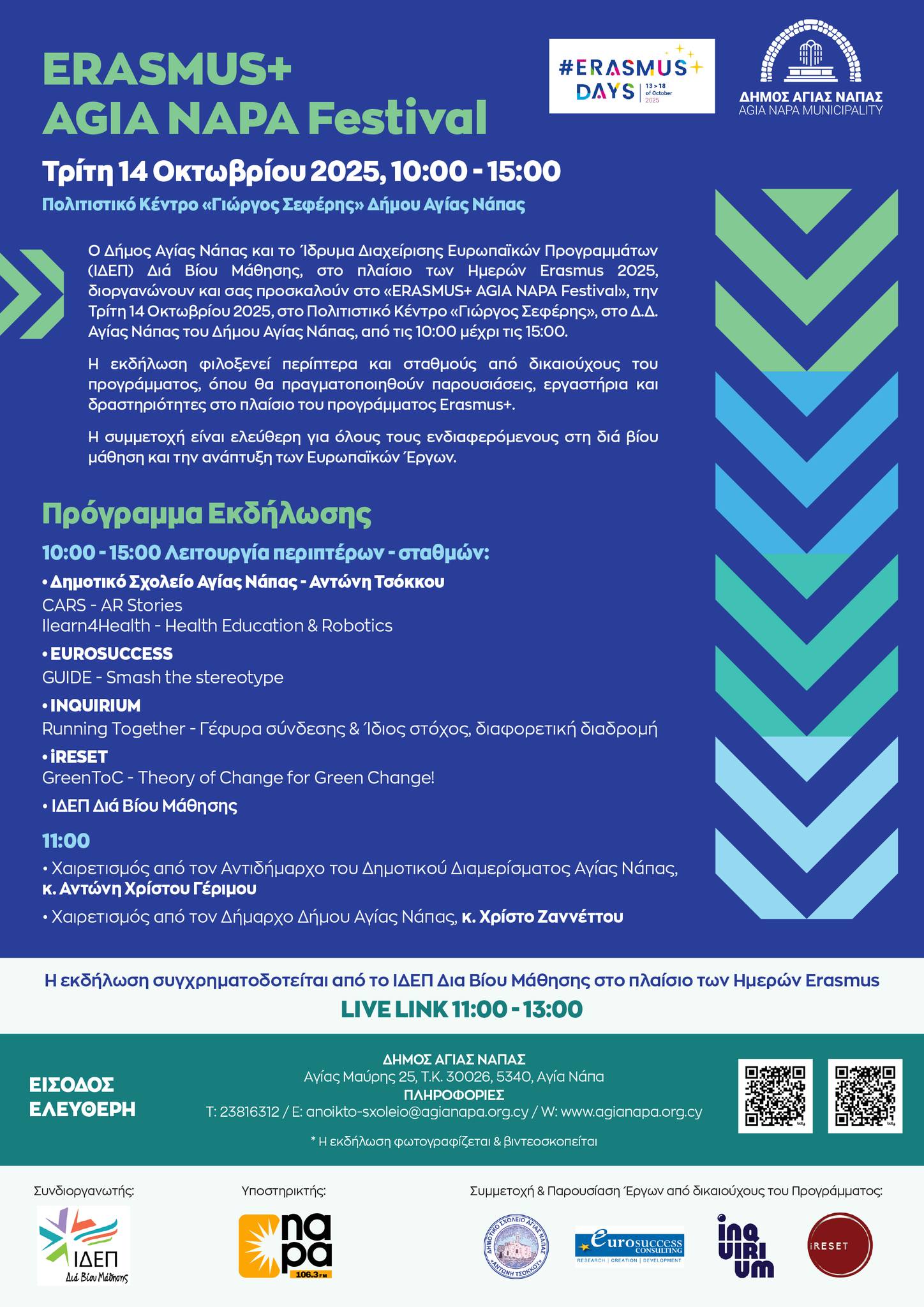 Ο Δήμος Αγίας Νάπας σε συνεργασία με το ΄Ιδρυμα Διαχείρισης Ευρωπαϊκών Προγραμμάτων (ΙΔΕΠ) διοργανώνουν την Τρίτη, 14 Οκτωβρίου, στο Πολιτιστικό Κέντρο Αγίας Νάπας «Γιώργος Σεφέρης», από τις 10:00-15:00, το «Erasmus+ AGIA NAPA Festival, στο πλαίσιο των Ημερών Erasmus 2025.