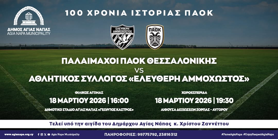 Μετά από επίσημη πρόσκληση του Δημοτικού Διαμερίσματος Αγίας Νάπας, οι παλαίμαχοι του ΠΑΟΚ Θεσσαλονίκης θα αναμετρηθούν φιλικά με τους παλαίμαχους του Αθλητικού Συλλόγου «Ελεύθερη Αμμόχωστος», σε μια συνάντηση που αναδεικνύει τη διαχρονική ικανότητα του αθλητισμού να καλλιεργεί δεσμούς και να ενώνει τους ανθρώπους.