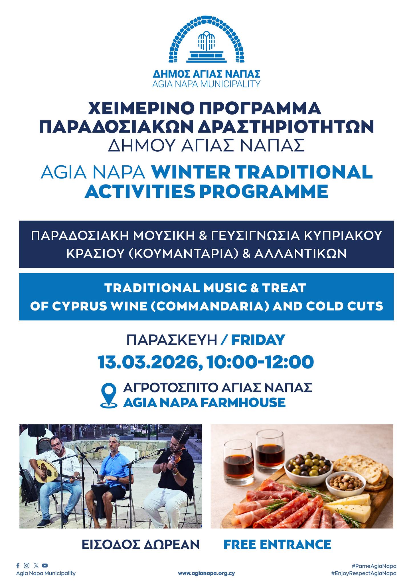 Την ευκαιρία να απολαύσουν το γνωστό παραδοσιακό κρασί – την Κουμανταρία και παραδοσιακών αλλαντικών, συνοδευόμενη από ζωντανή μουσική από το Μουσικό Σχήμα του Ηλία Χατζημιχαήλ, θα έχουν οι ξένοι επισκέπτες που διαμένουν στην Αγία Νάπα κατά τη χειμερινή περίοδο, καθώς και όλοι οι ενδιαφερόμενοι, την Παρασκευή 13 Μαρτίου 2026, στον προαύλιο χώρο του Αγροτόσπιτου, από τις 10:00 π.μ. έως τις 12:00 μ.
