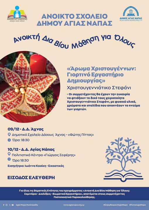 Στο πλαίσιο του προγράμματος «Ανοιχτή Δια Βίου Μάθηση για Όλους» του Ανοικτού Σχολείου Δήμου Αγίας Νάπας, το δεύτερο εργαστήριο του Δεκεμβρίου είναι αφιερωμένο στο Χριστουγεννιάτικο Στεφάνι. Οι συμμετέχοντες θα έχουν τη δυνατότητα να κατασκευάσουν το δικό τους χειροποίητο Χριστουγεννιάτικο Στεφάνι, συνδυάζοντας φυσικά υλικά, χρώματα και στολίδια που αποπνέουν το πνεύμα των γιορτών. Εισηγήτρια του εργαστηρίου είναι η κ. Ιωάννα Κασίκη, Εικαστικός.