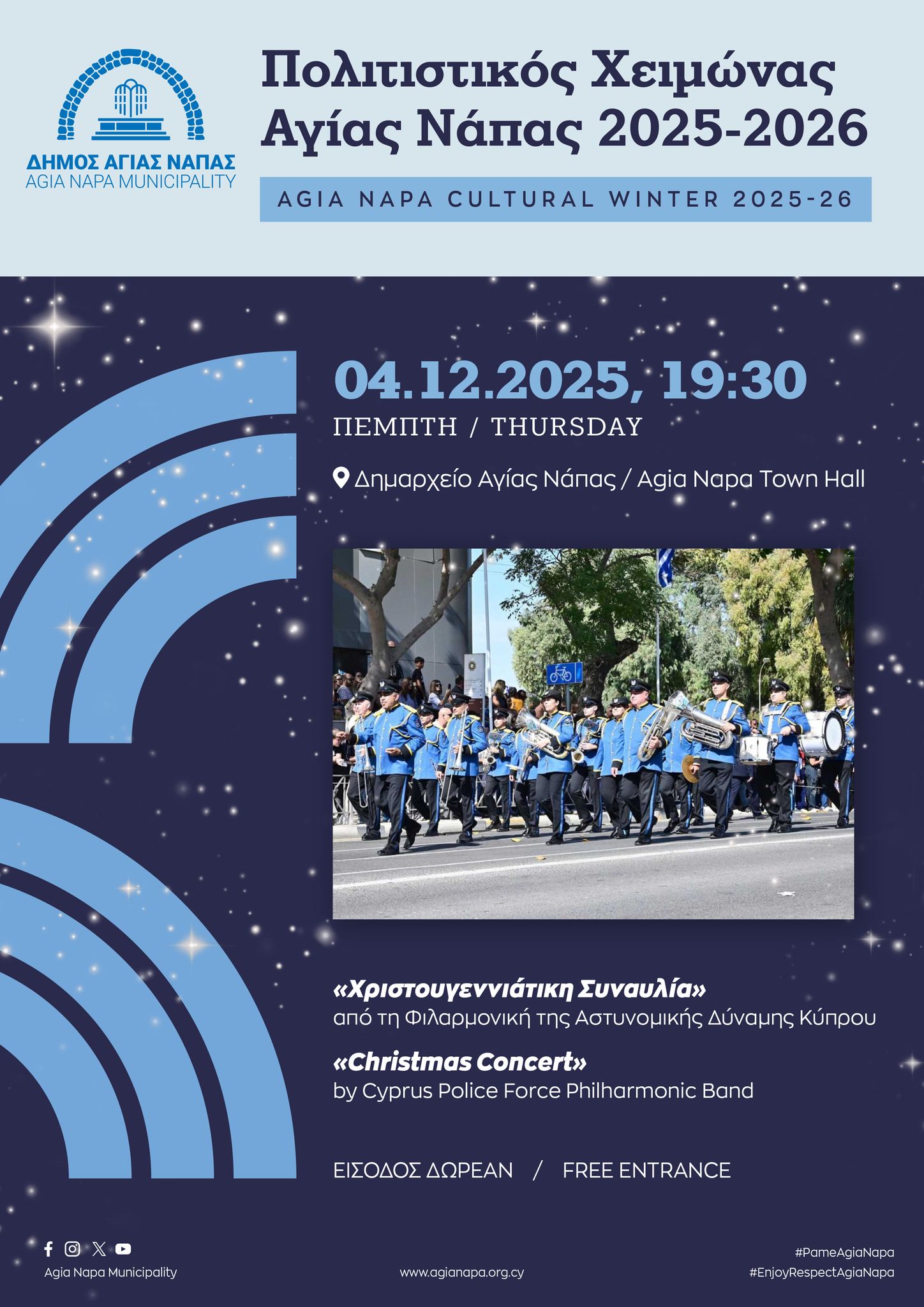 Με τη Χριστουγεννιάτικη Συναυλία που θα δώσει η Φιλαρμονική της Αστυνομικής Δύναμης Κύπρου την Πέμπτη 04 Δεκεμβρίου 2025, στο Δημοτικό Θέατρο του Δημοτικού Διαμερίσματος Αγίας Νάπας η ώρα 7.30 μ.μ. ανοίγει η αυλαία του Χειμερινού Πολιτιστικού Προγράμματος Εκδηλώσεων με τίτλο «Πολιτιστικός Χειμώνας 2025-2026», το οποίο διοργανώνει το Δημοτικό Διαμέρισμα Αγίας Νάπας του Δήμου Αγίας Νάπας.