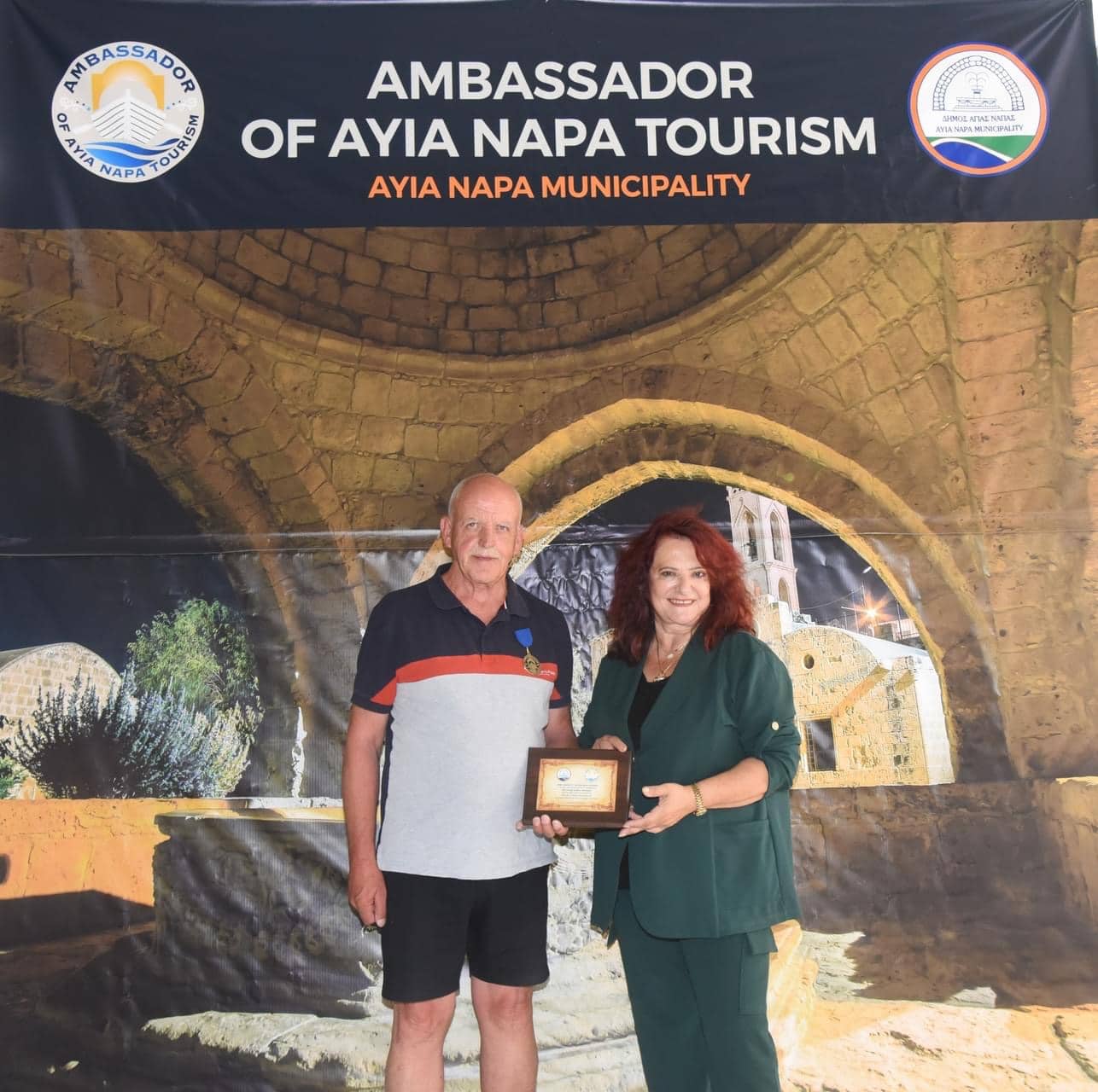 Κατά την απονομή της πλακέτας και του εμβλήματος του «Πρέσβη του Τουρισμού» της Αγίας Νάπας η κα. Τοφινή εξέφρασε τις εγκάρδιές της ευχαριστίες για τις πολυάριθμες επισκέψεις του και για την ιδιαίτερη προτίμηση που δείχνει για την Αγία Νάπα, επισημαίνοντάς του παράλληλα ότι ο Δήμος πλέον δεν τον θεωρεί απλά επισκέπτη αλλά δημότη της Αγίας Νάπας.