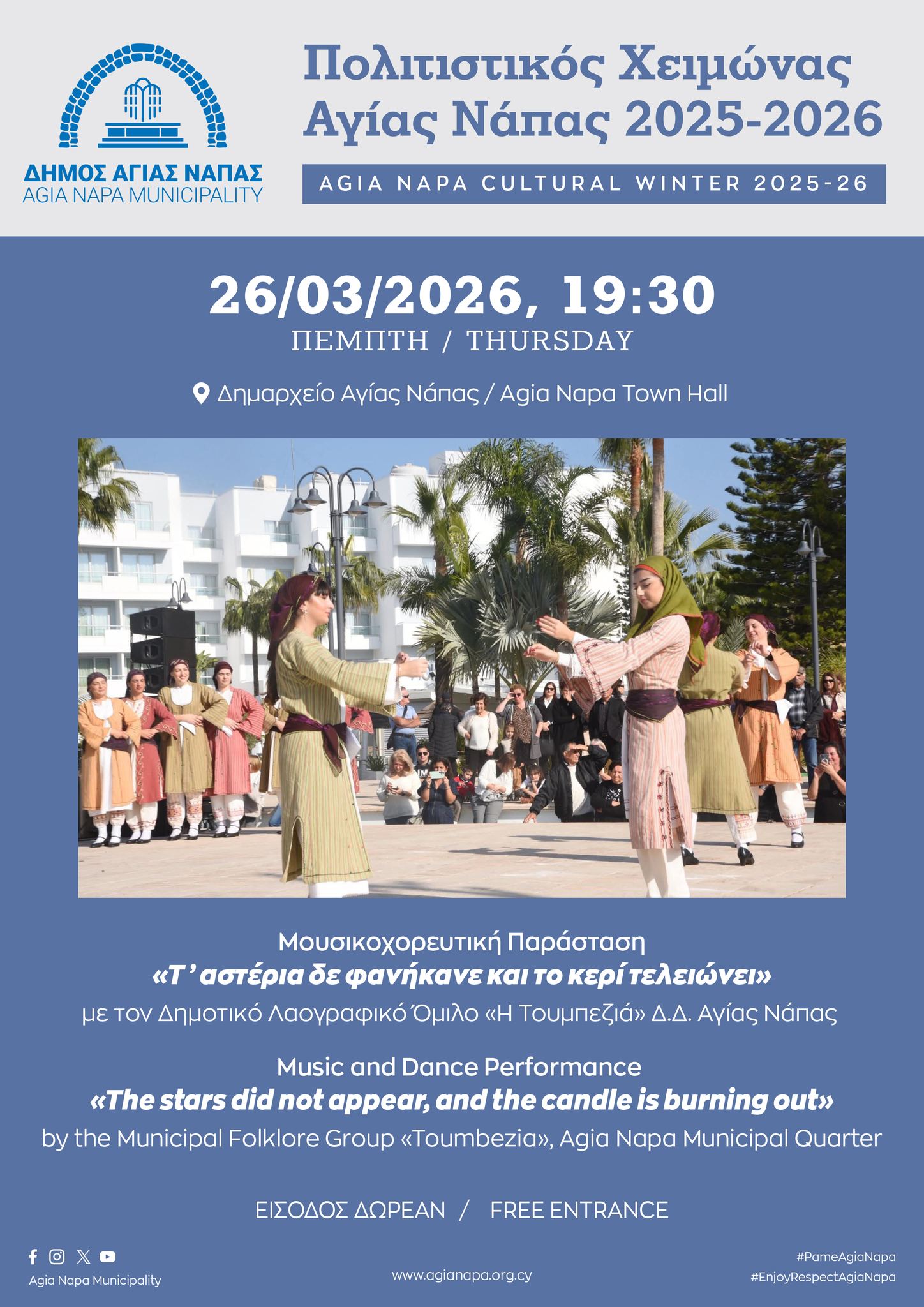 Με μια ξεχωριστή μουσικοχορευτική παράσταση ολοκληρώνεται την Πέμπτη 26 Μαρτίου 2026 ο κύκλος των εκδηλώσεων του Πολιτιστικού Χειμώνα 2025-2026 για τον μήνα Μάρτιο στον Δήμο Αγίας Νάπας.