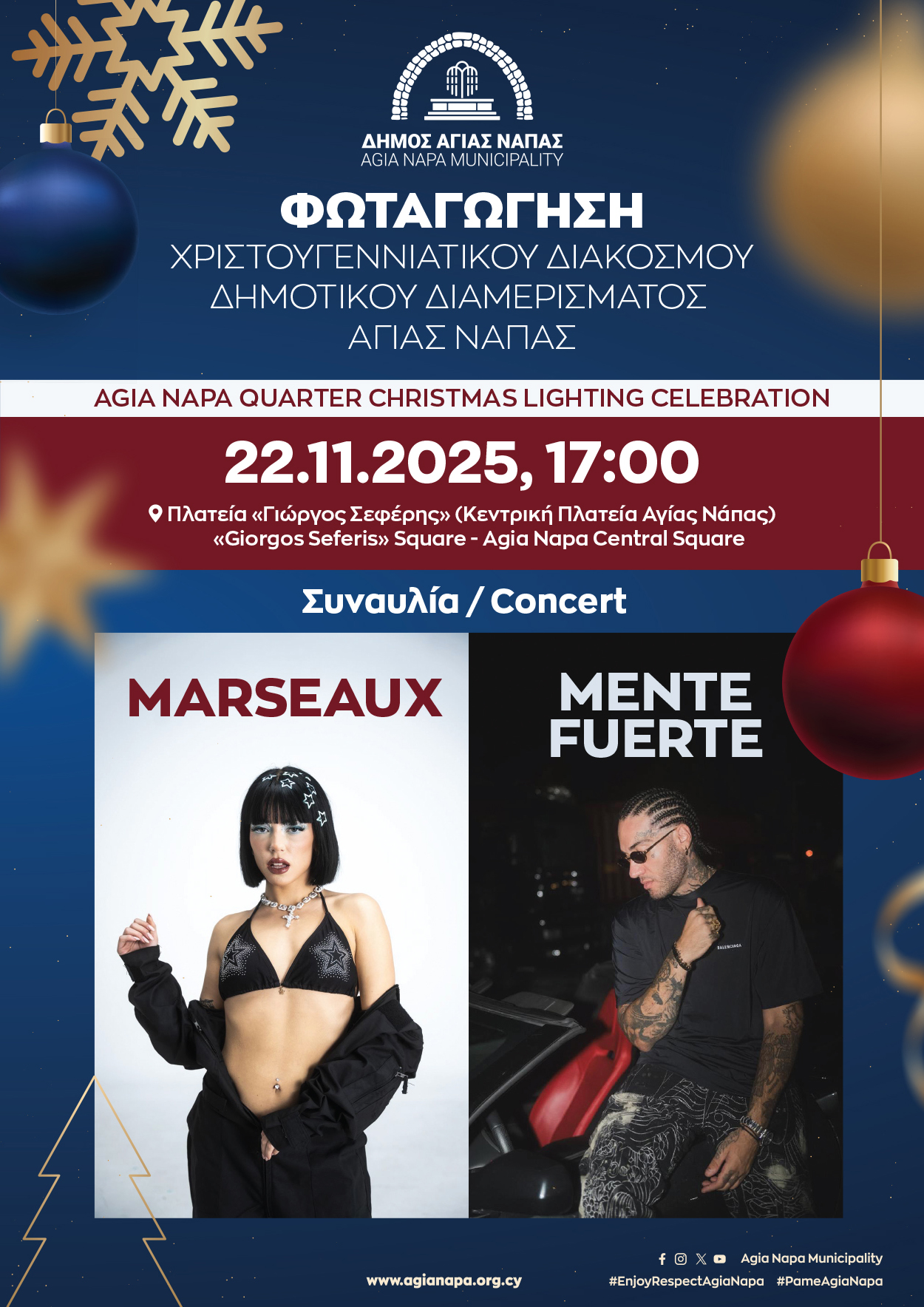 Με μεγάλη συναυλία με μία από τις πιο αγαπητές εκπροσώπους της σύγχρονης pop και rap μουσικής τη Marseaux και τον Mente Fuerte, ένα από τα πιο hot ονόματα της ελληνικής trap και rap σκηνής καθώς και με ένα πλούσιο καλλιτεχνικό πρόγραμμα και δραστηριότητες για μικρούς και μεγάλους, το Δημοτικό Διαμέρισμα Αγίας Νάπας θα εορτάσει φέτος την Φωταγώγηση του Χριστουγεννιάτικου Διάκοσμου που θα πραγματοποιηθεί το Σάββατο 22 Νοεμβρίου 2025, στην Κεντρική Πλατεία Αγίας Νάπας «Γιώργος Σεφέρης», σηματοδοτώντας την επίσημη έναρξη της Χριστουγεννιάτικης περιόδου.