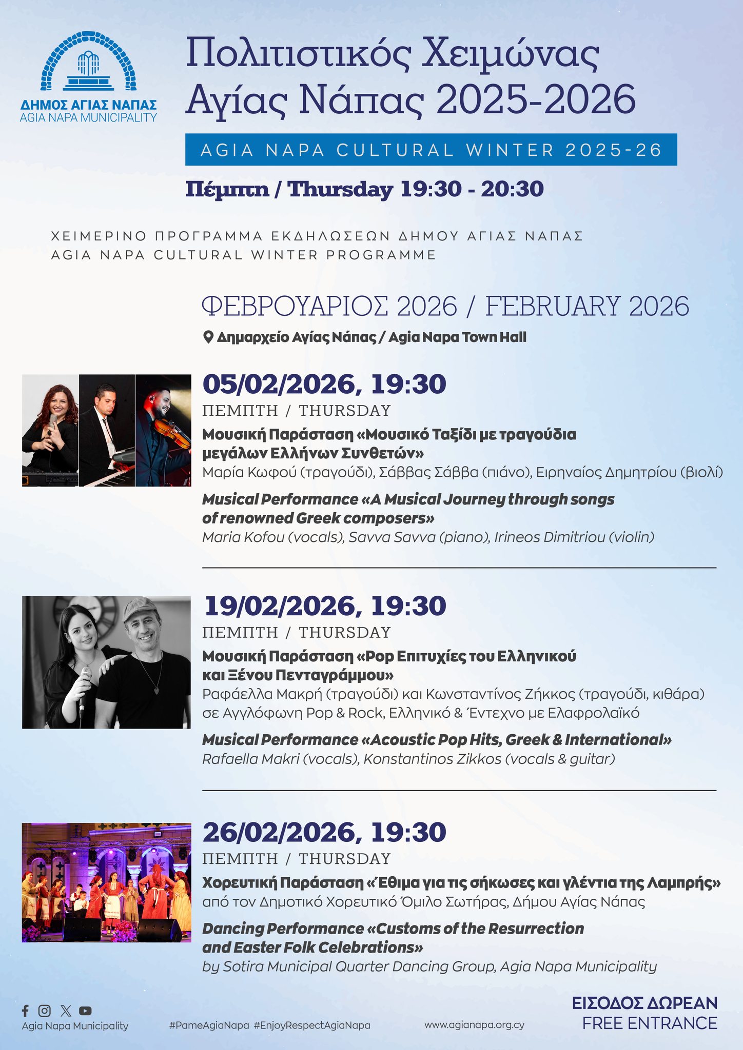 Με ένα πλούσιο και ποιοτικό πρόγραμμα μουσικών και χορευτικών παραστάσεων συνεχίζονται τον μήνα Φεβρουάριο 2026 οι εκδηλώσεις του «Πολιτιστικού Χειμώνα Αγίας Νάπας 2025-2026», που διοργανώνει ο Δήμος Αγίας Νάπας, προσφέροντας στο κοινό αξιόλογες πολιτιστικές εμπειρίες, ενισχύοντας ουσιαστικά την πολιτιστική δραστηριότητα της πόλης κατά τη χειμερινή περίοδο.