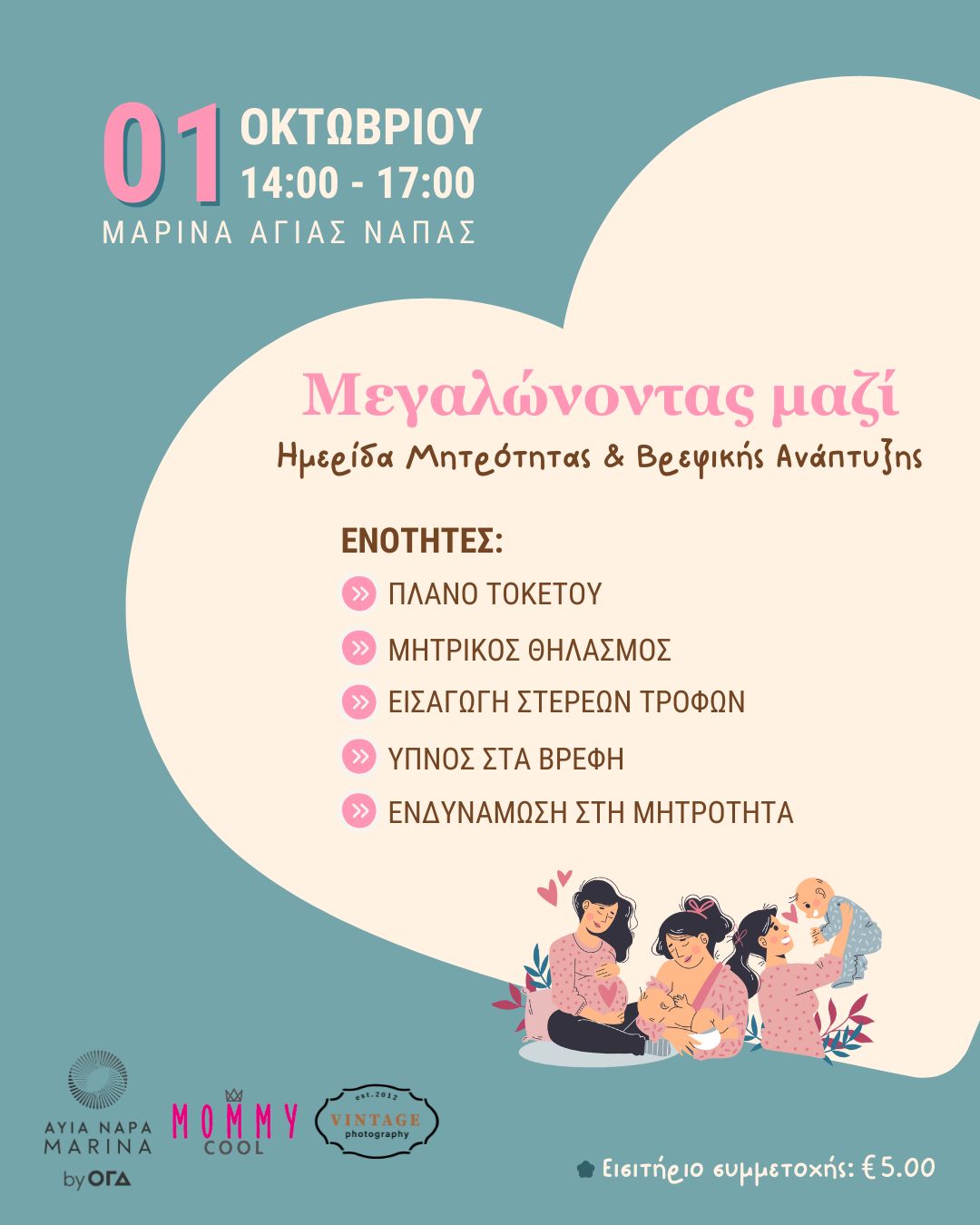 Μια ξεχωριστή ημερίδα Μητρότητας και Βρεφικής Ανάπτυξης με τίτλο «Μεγαλώνοντας Μαζί» διοργανώνεται την 1 Οκτωβρίου από τις 14:00-17:00 στην Μαρίνα Αγίας Νάπας.