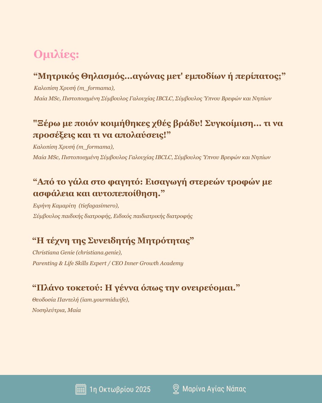 Καλοπίση Χρυσή, Μαία MSc, Πιστοποιημένη Σύμβουλος Γαλουχίας IBCLC, Σύμβουλος Ύπνου Βρέφων και Νηπίων Christiana Genie, Parenting & Life Skills Expert/CEO Inner Growth Academy Ειρήνη Καμαρίτη, Σύμβουλος Παιδικής Διατροφής, ειδικός παιδιατρικής διατροφής Θεοδοσία Παντελή, Νοσηλεύτρια, Μαία