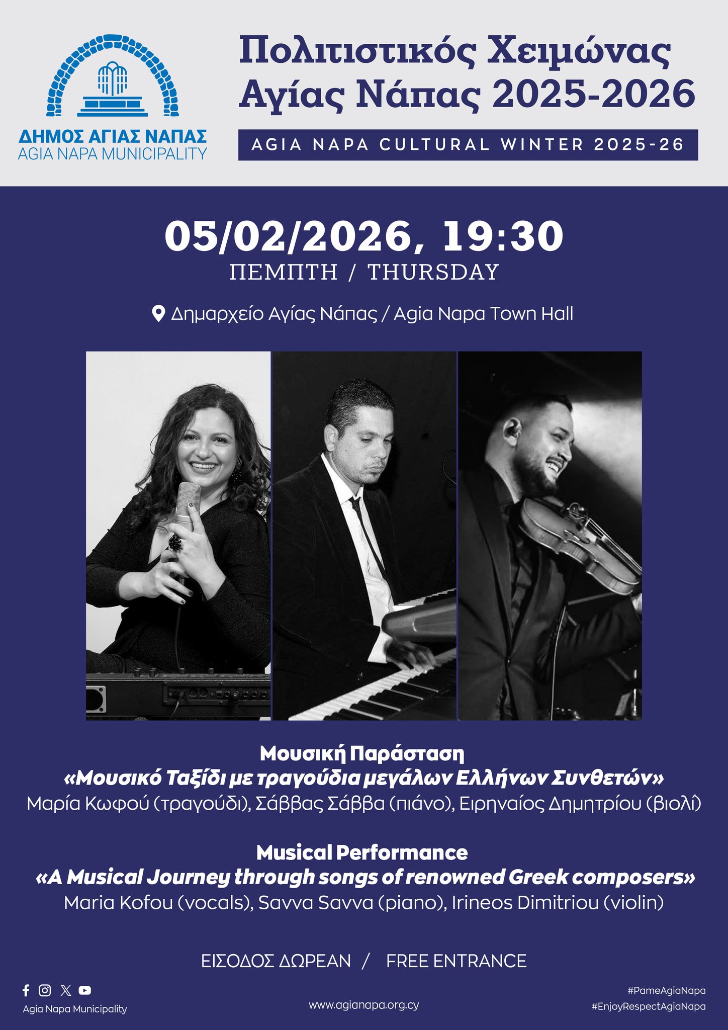 Τη μουσική παράσταση «Μουσικό Ταξίδι με τραγούδια μεγάλων Ελλήνων Συνθετών» παρουσιάζει ο «Πολιτιστικός Χειμώνας 2025-2026» του Δήμου Αγίας Νάπας, την Πέμπτη 05 Φεβρουαρίου 2026.