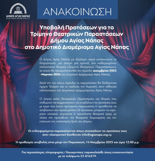 Ο Δήμος Αγίας Νάπας ανακοινώνει ότι και φέτος θα διοργανώσει, την περίοδο Δεκεμβρίου 2025 – Μαρτίου 2026, το καθιερωμένο επιτυχημένο πολιτιστικό θεσμό «Τρίμηνο Θεατρικών Παραστάσεων 2025-2026».