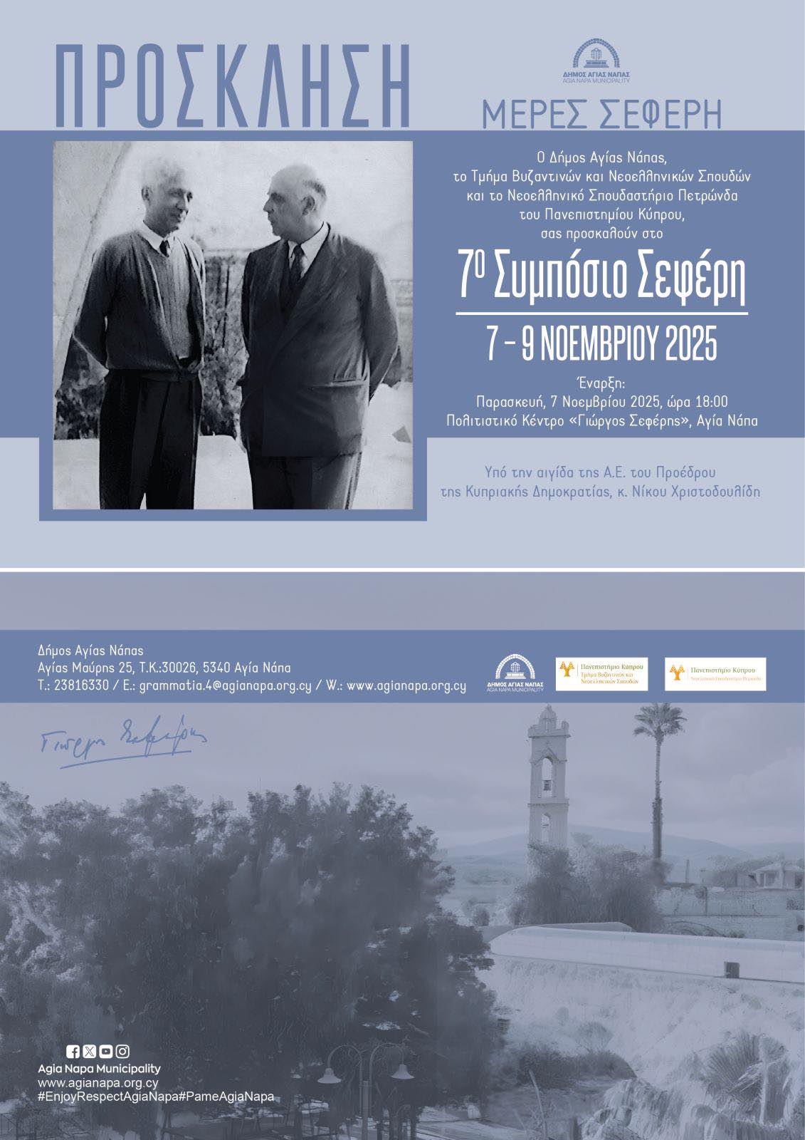 Ο Δήμος Αγίας Νάπας, σε συνεργασία με το Τμήμα Βυζαντινών και Νεοελληνικών Σπουδών και το Νεοελληνικό Σπουδαστήριο Πετρώνδα του Πανεπιστημίου Κύπρου, διοργανώνει το 7ο Συμπόσιο Σεφέρη, στο πλαίσιο του θεσμού «Μέρες Σεφέρη», το οποίο θα πραγματοποιηθεί από τις 7 έως τις 9 Νοεμβρίου 2025, στο Πολιτιστικό Κέντρο Αγίας Νάπας «Γιώργος Σεφέρης».
