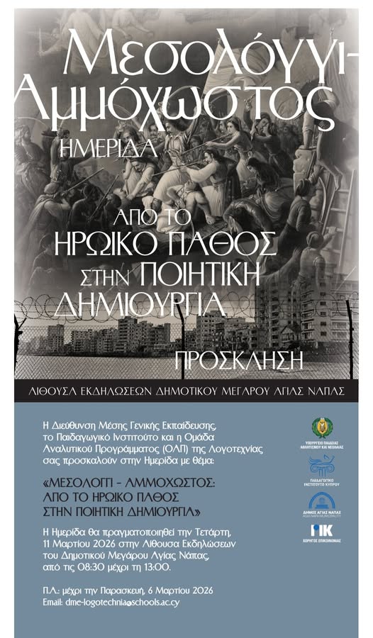 Ο Δήμος Αγίας Νάπας φιλοξενεί, σε συνεργασία με το Υπουργείο Παιδείας, Αθλητισμού και Νεολαίας, το Παιδαγωγικό Ινστιτούτο Κύπρου και τον Δήμο Αμμοχώστου, την ημερίδα «Μεσολόγγι – Αμμόχωστος: Από το ηρωικό πάθος στην ποιητική δημιουργία», η οποία θα πραγματοποιηθεί την Τετάρτη, 11 Μαρτίου 2026, η ώρα 08:30, στην αίθουσα εκδηλώσεων του Δημαρχείου Αγίας Νάπας.
