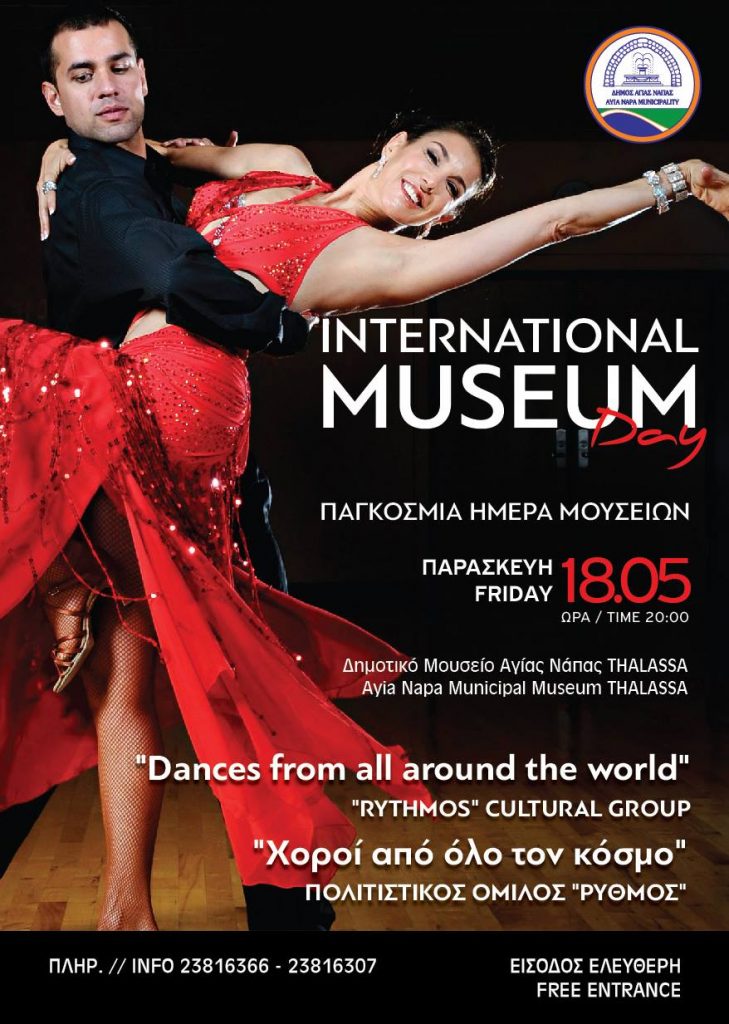 Με την ευκαιρία του εορτασμού της Διεθνούς Ημέρας Μουσείων την Παρασκευή 18 Μαϊου, ο Δήμος Αγίας Νάπας διοργανώνει στο Δημοτικό Μουσείο «Θάλασσα» η ώρα 18:00 τη χορευτική παράσταση «Χοροί από όλο τον κόσμο», την οποία θα παρουσιάσει ο Πολιτιστικός Όμιλος «Ρυθμός».
