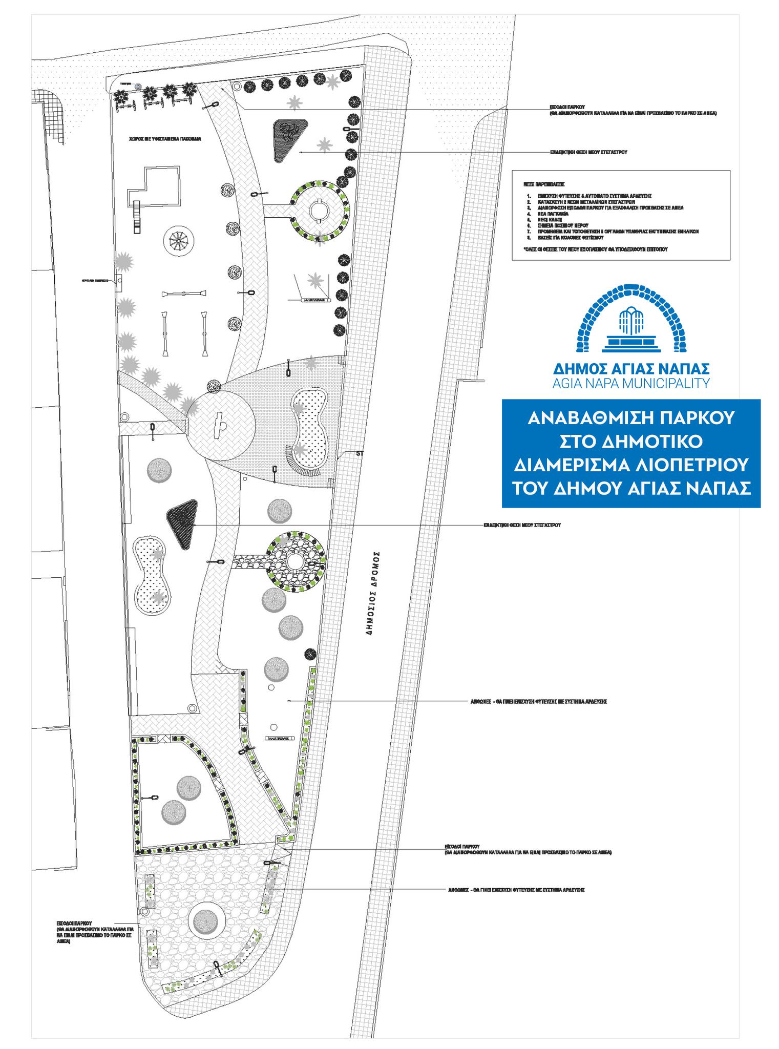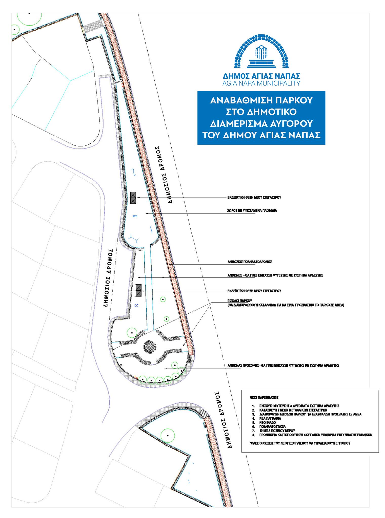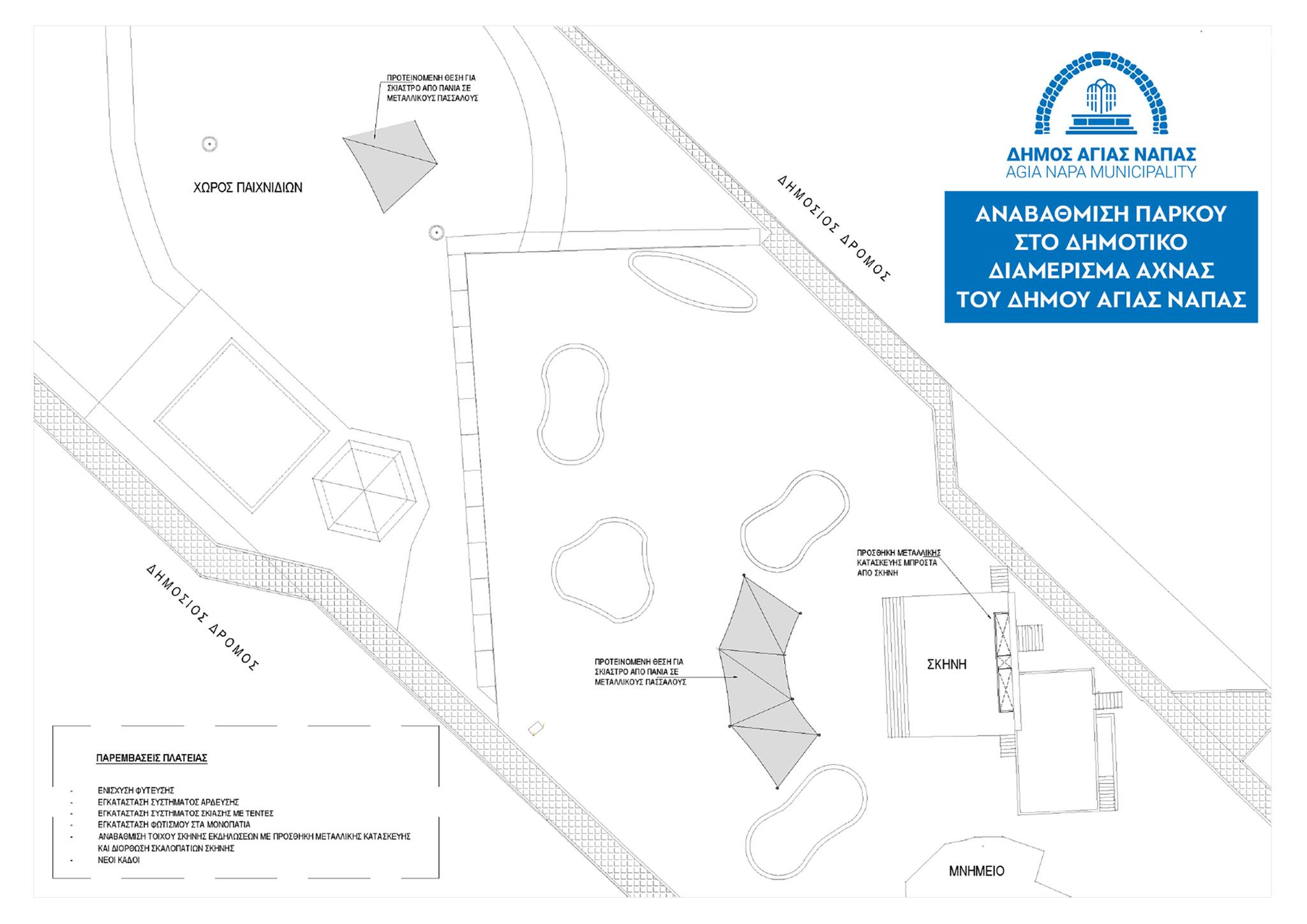 Υπογράφηκαν πρόσφατα από τον Δήμαρχο Αγίας Νάπας, κ. Χρίστο Ζαννέττου, και τον Διευθυντή της Εταιρείας D. Kouklis Constructions Ltd, κ. Δημήτρη Κουκλή, τρία έργα που αφορούν την αναβάθμιση των υφιστάμενων πάρκων στα Δημοτικά Διαμερίσματα Λιοπετρίου, Αυγόρου και Άχνας, συμπεριλαμβανομένων και των κτιστών σημάνσεων παραπλεύρως των εισόδων των εν λόγω Διαμερισμάτων. Το συνολικό κόστος των έργων ανέρχεται σε 174.918,00 ευρώ, συμπεριλαμβανομένου του ΦΠΑ.