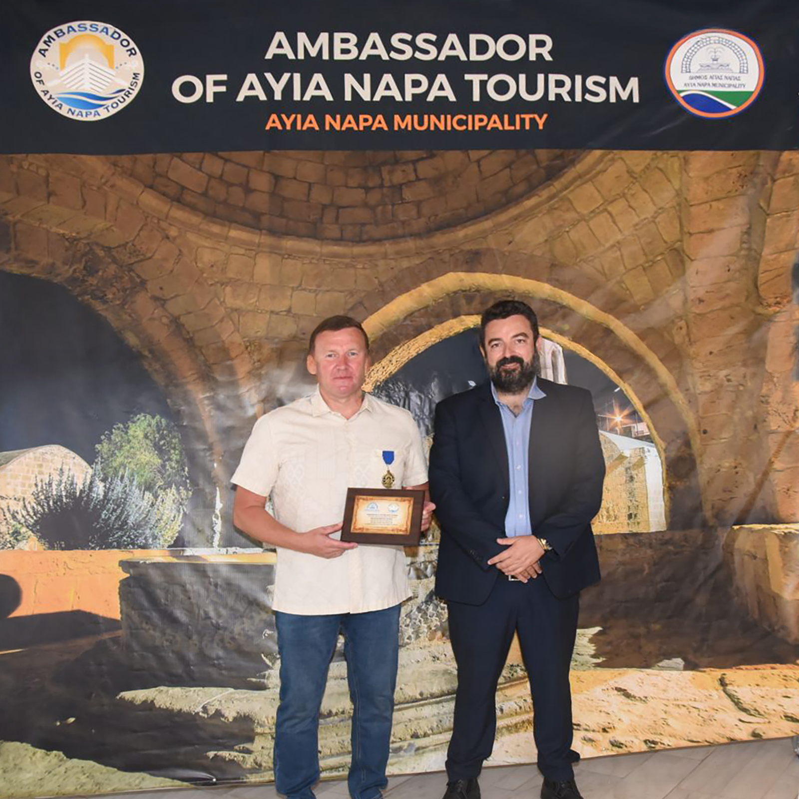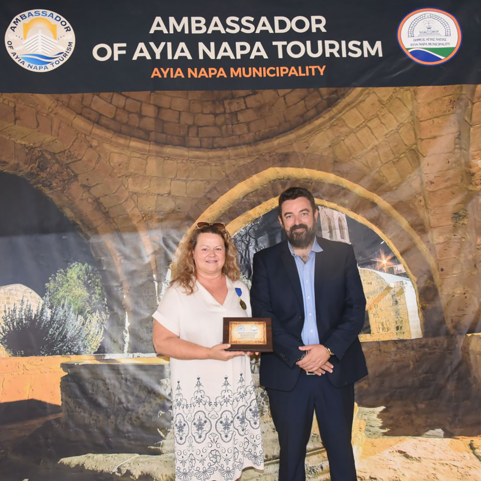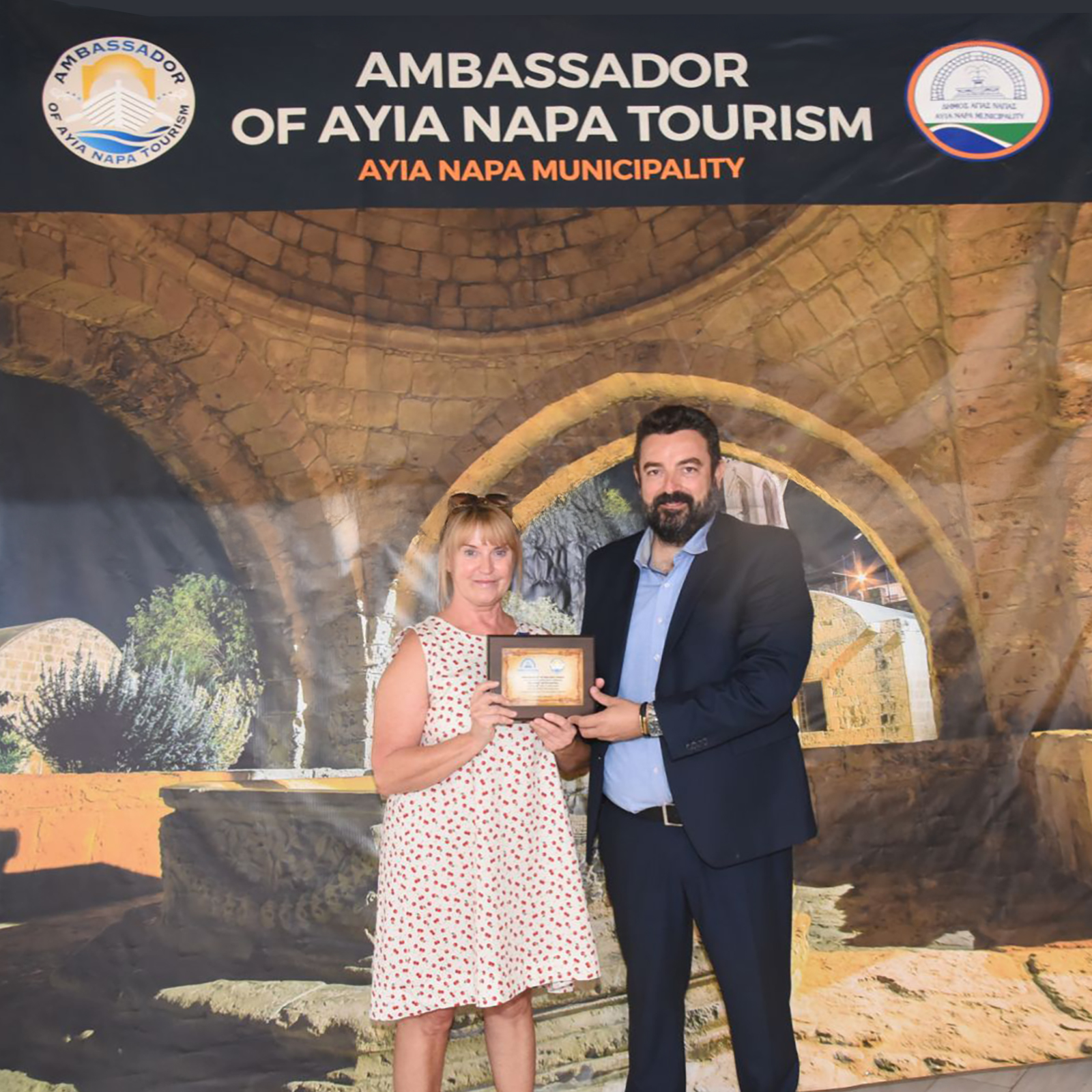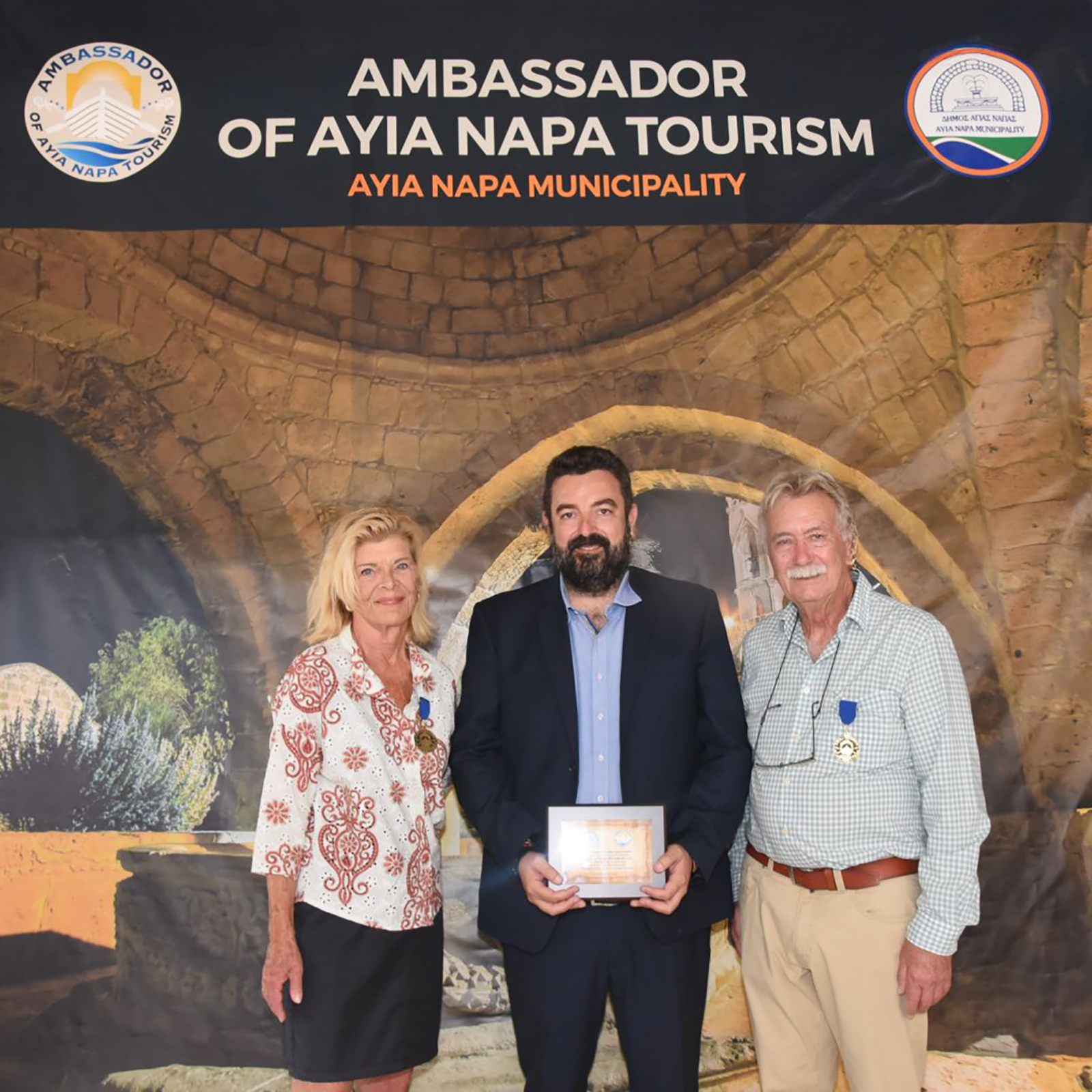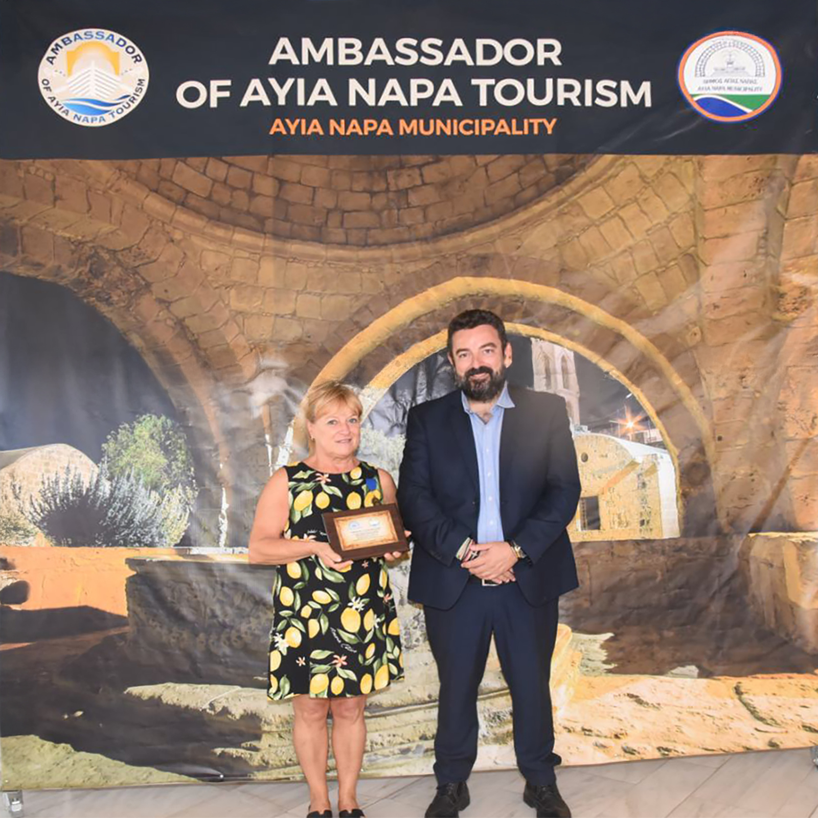 The commemorative plaques and the «Tourism Ambassador» emblem were presented by the Αgia Napa Vice Mayor, Mr Antonis Christou, on behalf of the Mayor, Mr Christos Zannettou, who warmly congratulated the honorees for their long-standing presence and their contribution to the positive international image of the city.