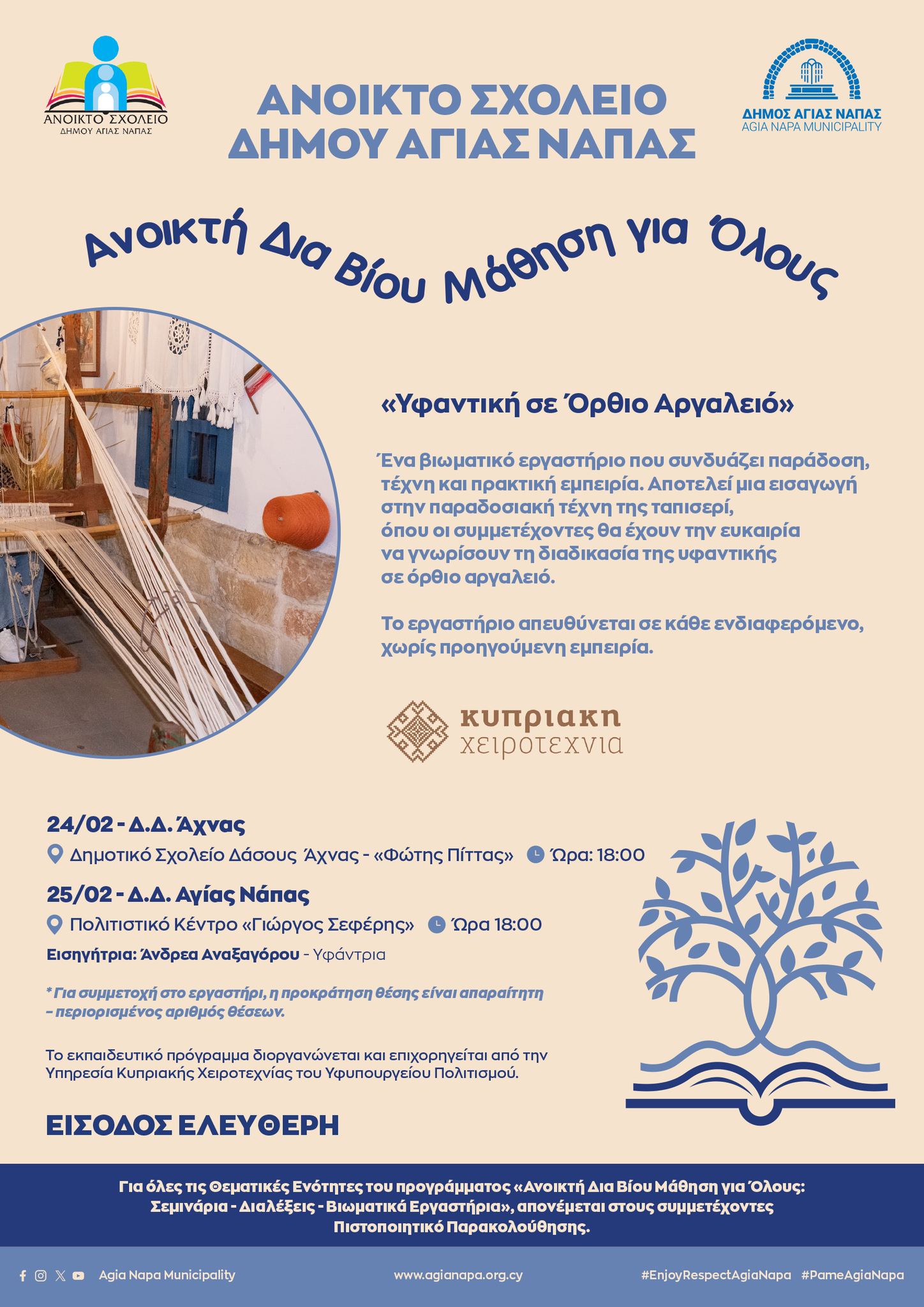 Το Ανοικτό Σχολείο του Δήμου Αγίας Νάπας ολοκληρώνει τις δράσεις του προγράμματος «Ανοικτή Δια Βίου Μάθηση για Όλους» για τον μήνα Φεβρουάριο με ένα ξεχωριστό βιωματικό εργαστήριο με τίτλο «Υφαντική σε Όρθιο Αργαλειό». Μέσα από τις δράσεις του, το Ανοικτό Σχολείο συνεχίζει να προσφέρει ποιοτικές ευκαιρίες μάθησης που προάγουν τη δια βίου εκπαίδευση και αναδεικνύουν την πολιτιστική μας κληρονομιά. Το συγκεκριμένο εργαστήριο συνδυάζει παράδοση, τέχνη και πρακτική εμπειρία, προσφέροντας στους συμμετέχοντες μια μοναδική δημιουργική εμπειρία.