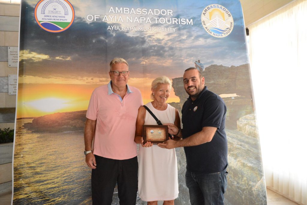 Ο κ. Καρούσος εξέφρασε την ικανοποίησή του που ένα ακόμη ζευγάρι τιμάται για τις πολλαπλές επισκέψεις του και που ο κατάλογος του Δήμου με τους Πρέσβεις του Τουρισμού μακραίνει συνεχώς, κάτι το οποίο όπως επισήμανε, αποδεικνύει έμπρακτα ότι οι επαναλαμβανόμενοι επισκέπτες και πιστοί φίλοι της Αγίας Νάπας είναι πάρα πολλοί.