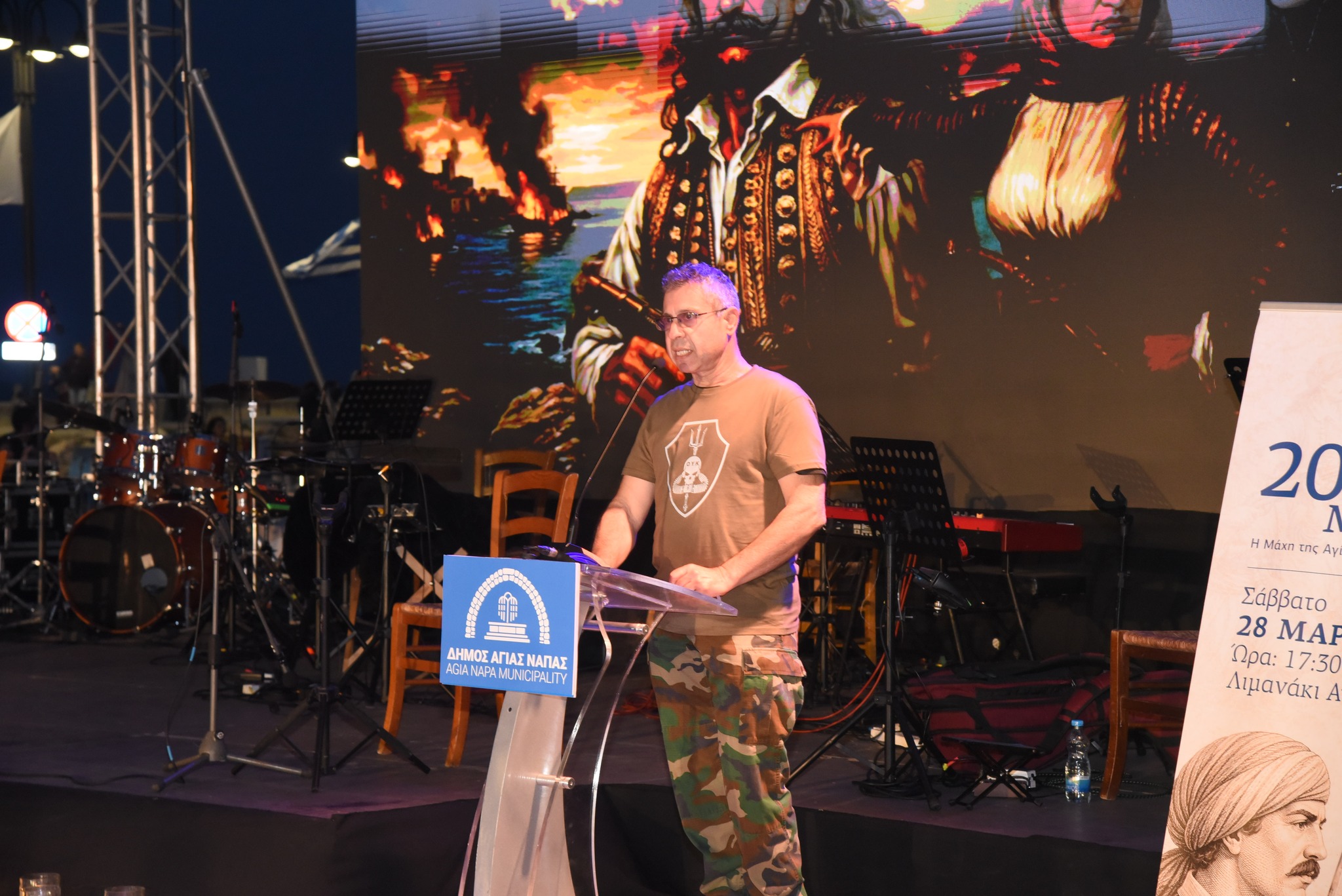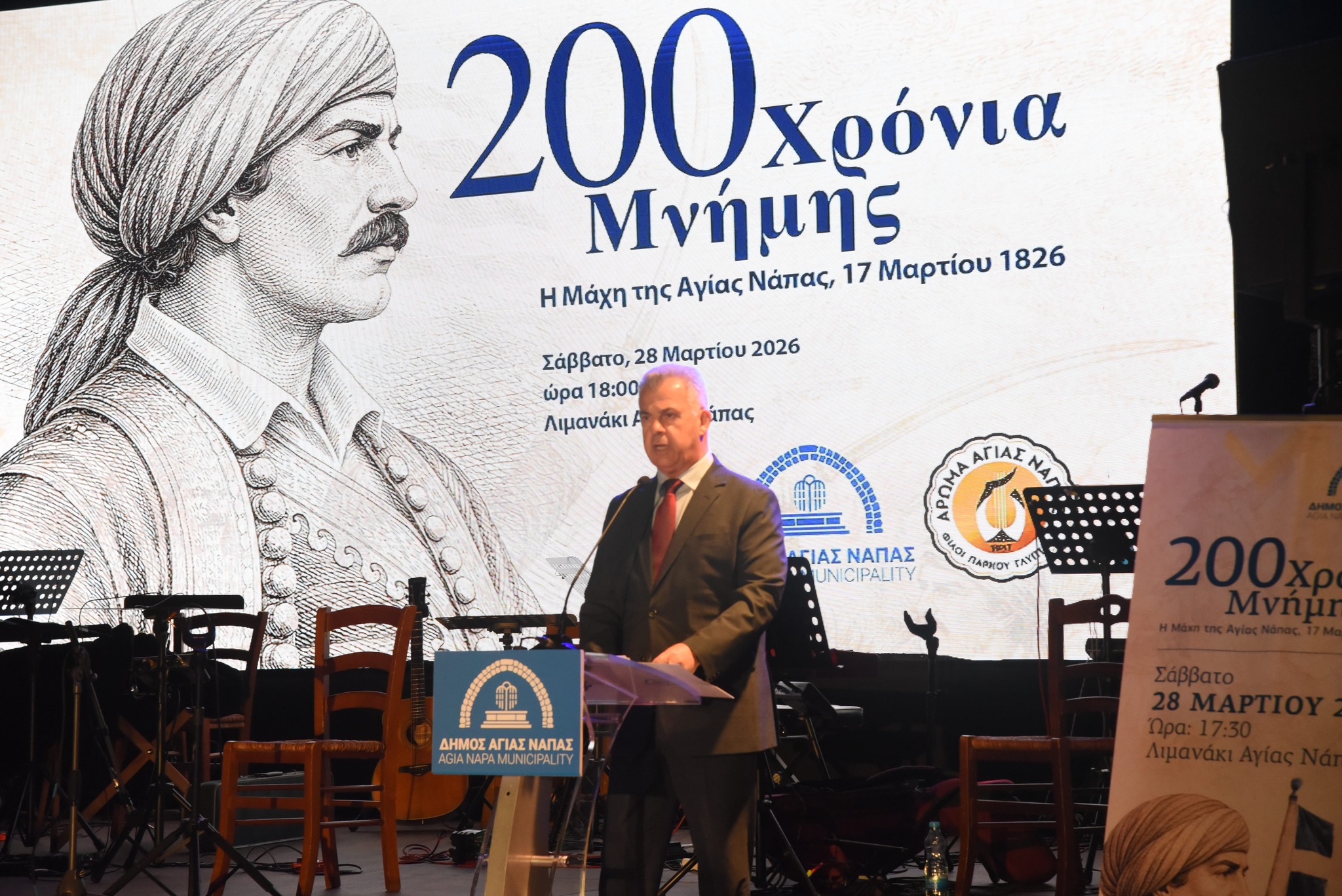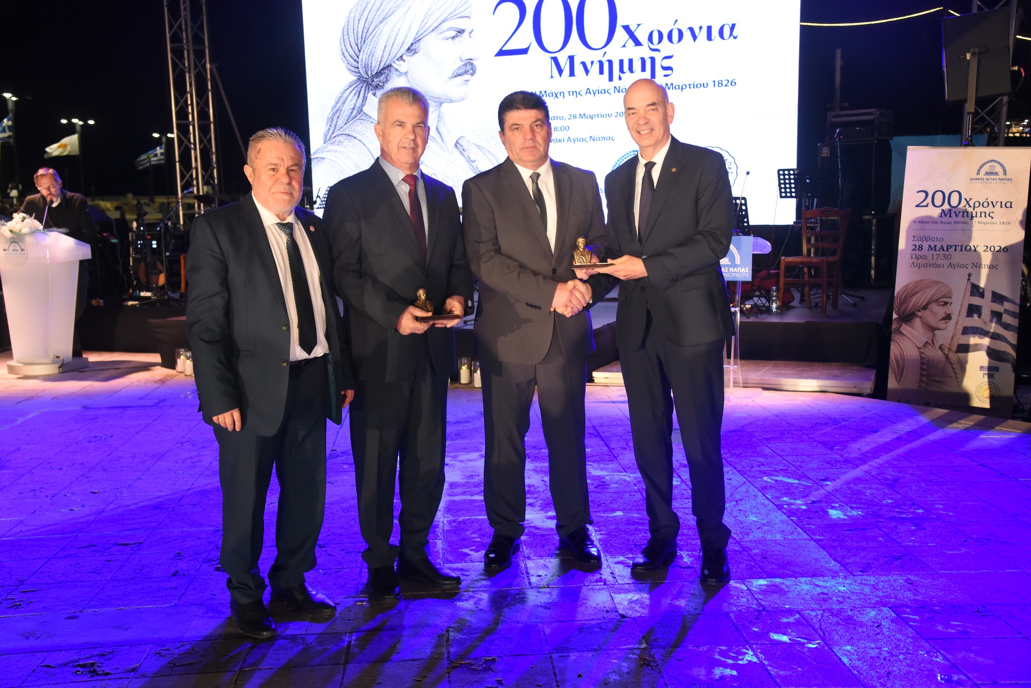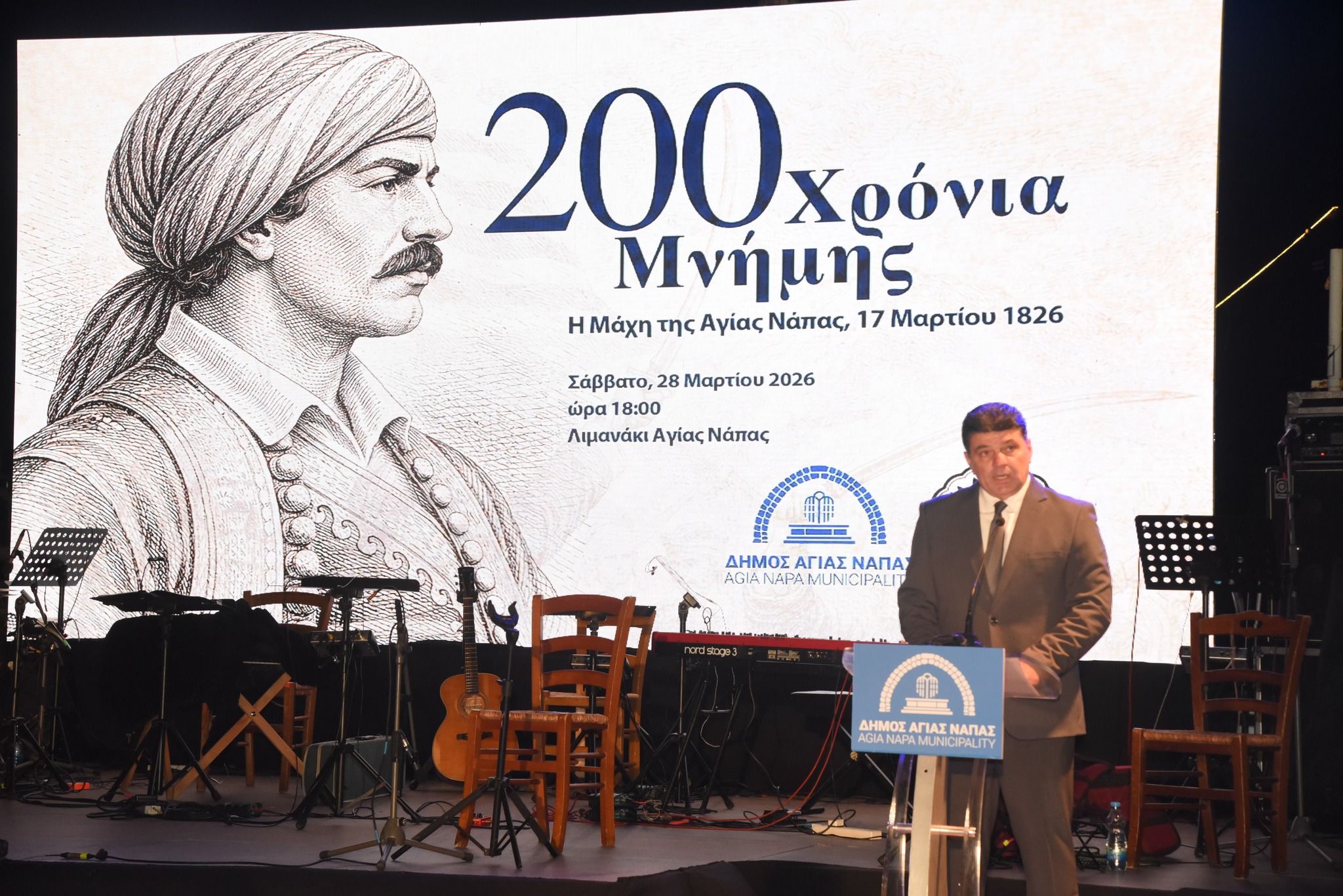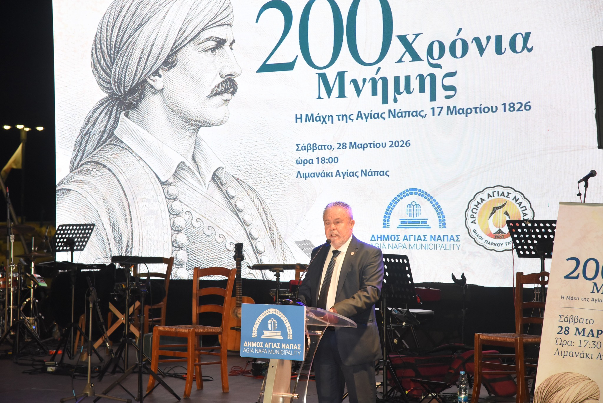 Με ιδιαίτερη λαμπρότητα και μεγαλοπρέπεια ο Δήμος Αγίας Νάπας και ο Σύνδεσμος «Άρωμα» Αγίας Νάπας – Φίλοι Πάρκου Γλυπτικής τίμησαν το Σάββατο 28 Μαρτίου 2026, το βράδυ, την 200ή επέτειο από τη Μάχη της Αγίας Νάπας (17 Μαρτίου 1826), τη μοναδική καταγεγραμμένη μάχη της Ελληνικής Επανάστασης του 1821 που διεξήχθη σε κυπριακό έδαφος.