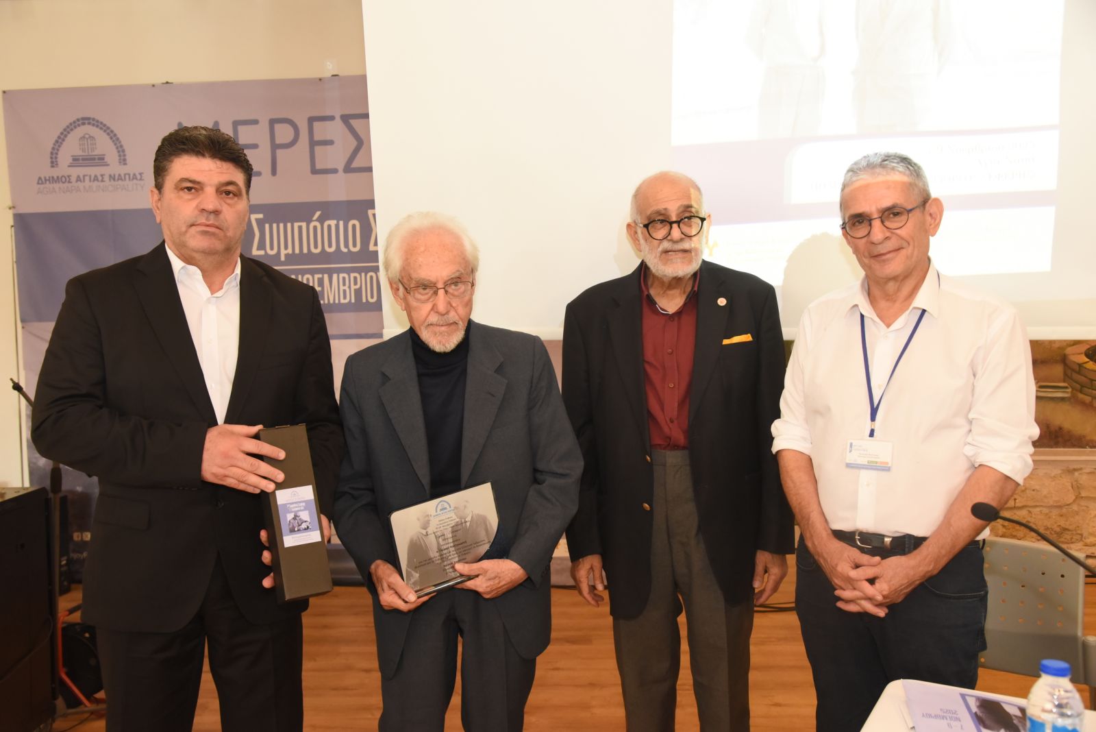 Ο Δήμαρχος κ. Χρίστος Ζαννέττου μαζί με τον Αντιδήμαρχο κ. Αντώνη Χρίστου, τους επικεφαλείς της Επιστημονικής Επιτροπής του Συμποσίου, Γιώργο Γεωργή και Παντελή Βουτουρή, και των Μελών της Οργανωτικής Επιτροπής Αδάμο Αδάμου και Χριστάκη Πίττα, επέδωσαν στον τιμώμενο τους τέσσερις τόμους των προηγούμενων Συμποσίων, συνοδευόμενους από αναμνηστικά δώρα, εκφράζοντας την εκτίμηση και τον σεβασμό της τοπικής κοινωνίας προς το έργο του.