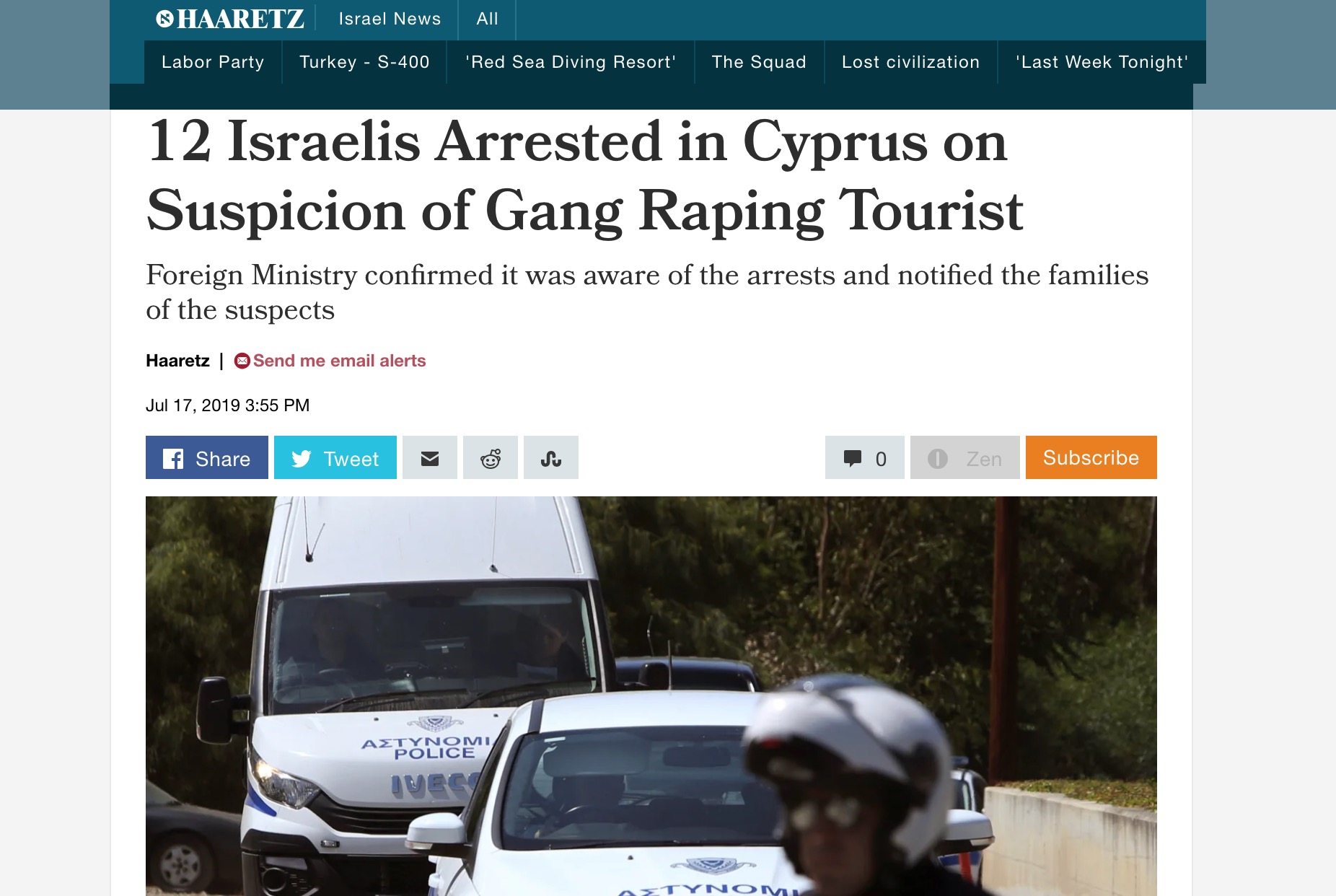 Σύμφωνα με την υπόθεση η 19χρονη από τη Βρετανία κατήγγειλε στον Αστυνομικό Σταθμό Αγίας Νάπας ότι τις πρώτες πρωινές ώρες σήμερα έπεσε θύμα βιασμού από δώδεκα άτομα από το Ισραήλ σε δωμάτιο ξενοδοχείου στο οποίο διέμεναν τόσο η ίδια όσο και οι ύποπτοι.