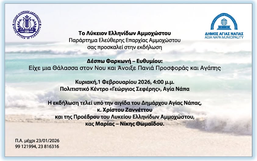 Τιμητική εκδήλωση αφιερωμένη στη Δέσπω Φαρκωνή – Ευθυμίου, μια εμβληματική μορφή της εθελοντικής και πολιτιστικής προσφοράς της Αμμοχώστου, συνδιοργανώνουν ο Δήμος Αγίας Νάπας και το Λύκειο Ελληνίδων Αμμοχώστου.