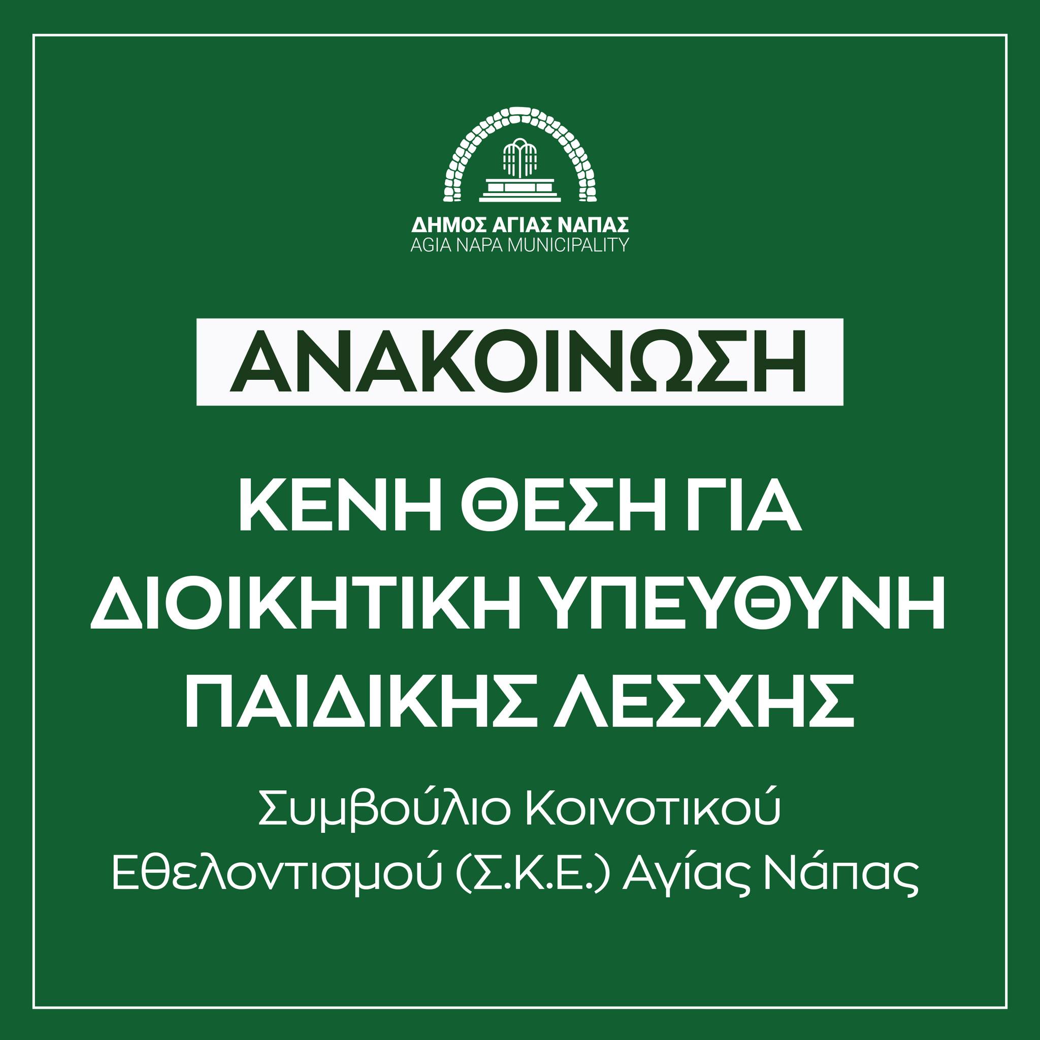 Το Συμβούλιο Κοινοτικού Εθελοντισμού (Σ.Κ.Ε.) Αγίας Νάπας ζητά να προσλάβει εκπαιδευτικό για την θέση διοικητικής υπεύθυνης Παιδικής Λέσχης για πενθήμερη απασχόληση.
