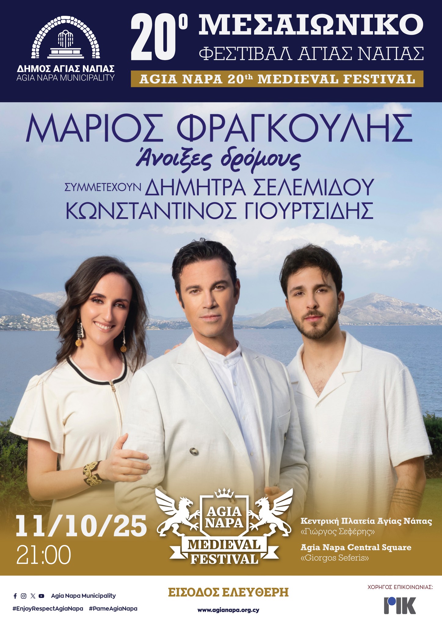 Τον Μάριο Φραγκούλη και τη συναυλία «Άνοιξες Δρόμους» θα φιλοξενήσει το 20ο Μεσαιωνικό Φεστιβάλ Αγίας Νάπας, το Σάββατο 11 Οκτωβρίου 2025, Συμμετέχουν η Δήμητρα Σελεμίδου και ο Κωνσταντίνος Γιουρτσίδης.