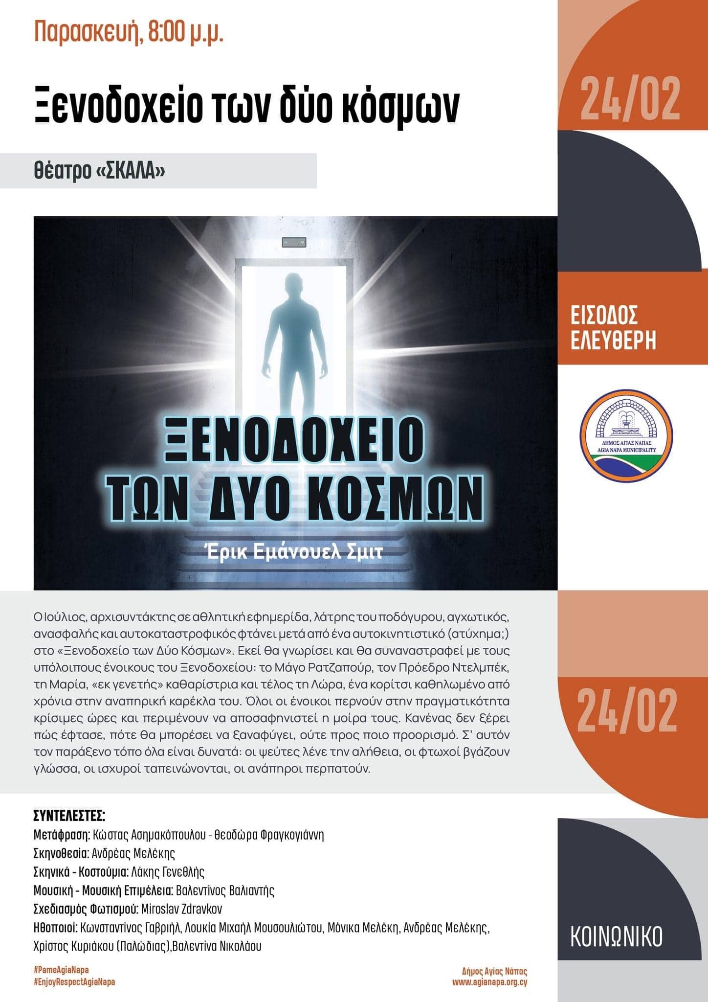 “Ξενοδοχείο των δύο κόσμων” από το Θέατρο ΣΚΑΛΑ, στο πλαίσιο του Τρίμηνου Θεατρικού Παραστάσεων του Δήμου Αγίας Νάπας την Παρασκευή 24/2 στις 8:00 μ.μ. στο Δημοτικό Θέατρο Αγίας Νάπας.