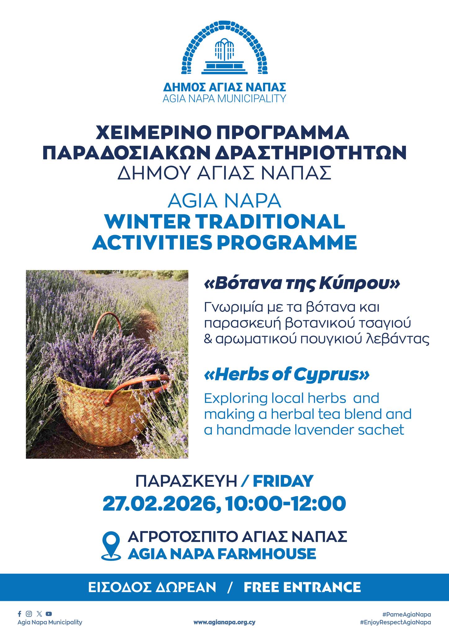 Ο Δήμος Αγίας Νάπας συνεχίζει δυναμικά το Χειμερινό Πρόγραμμα Παραδοσιακών Δραστηριοτήτων, προσφέροντας μοναδικές εμπειρίες στους επισκέπτες που επιλέγουν την Αγία Νάπα για τη διαμονή τους και κατά τους χειμερινούς μήνες.