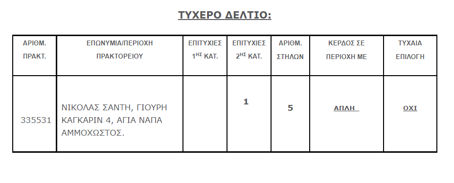 Aν και δεν βρέθηκε ο μεγάλος νικητής, ο τυχερός της κλήρωσης που κέρδισε τις 50.000 ευρώ, έπαιξε το δελτίο του σε πρακτορείο στοιχημάτων στην Αγία Νάπα.