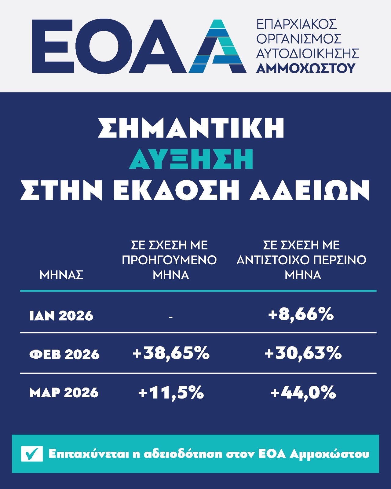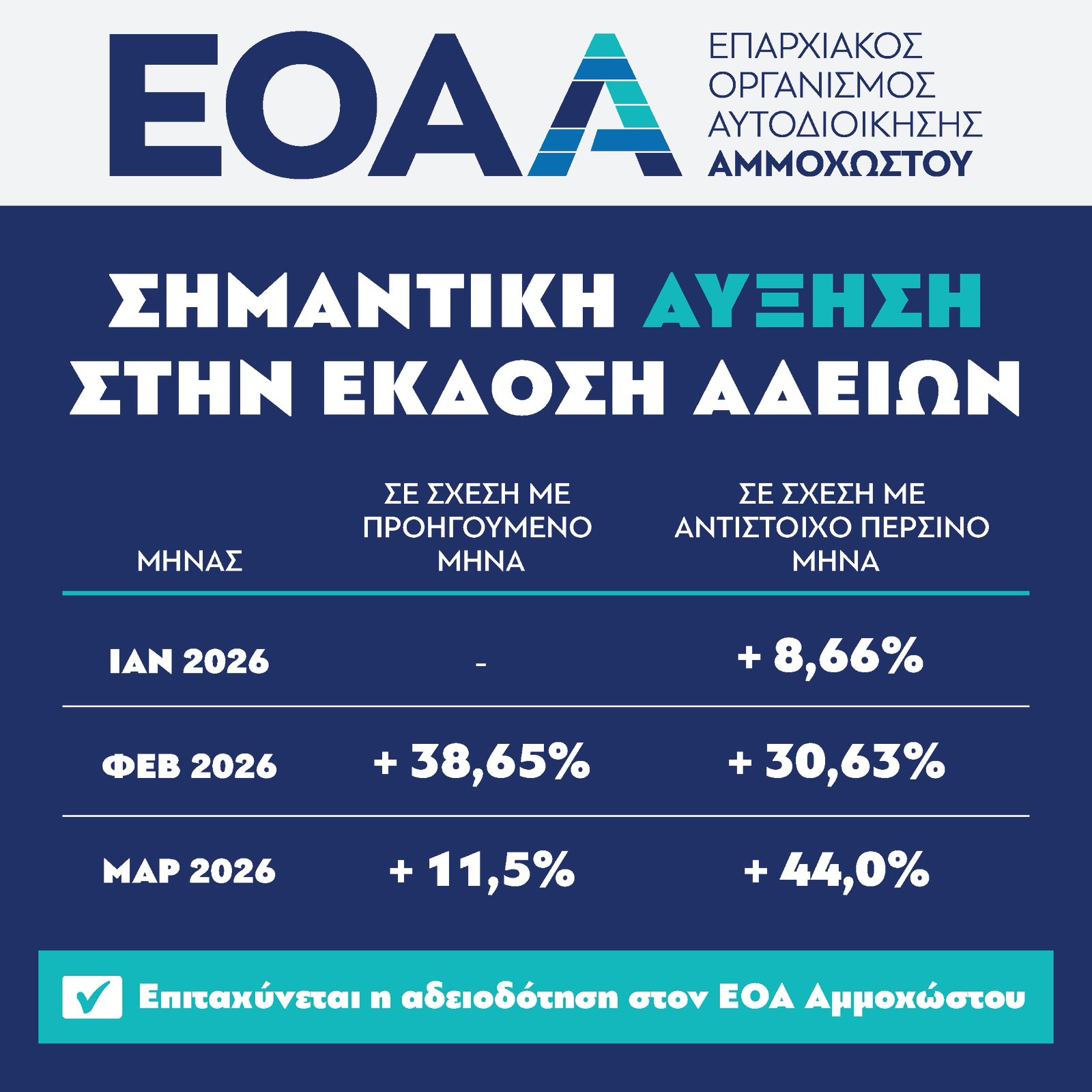 Ο Επαρχιακός Οργανισμός Αυτοδιοίκησης Αμμοχώστου καταγράφει σαφή και σταθερή ανοδική πορεία στην έκδοση αδειών, επιβεβαιώνοντας την αποτελεσματικότητα των ενεργειών που υλοποιούνται για την επιτάχυνση των διαδικασιών αδειοδότησης.