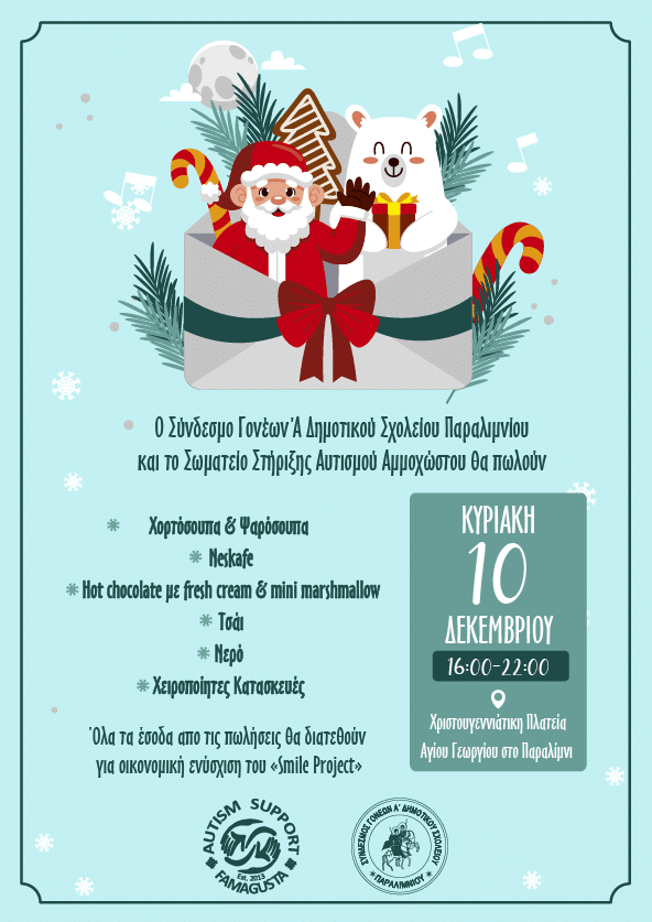 Tην Κυριακή 10 Δεκεμβρίου και από τις 16:00 μέχρι τις 22:00 ο Σύνδεσμος Γονέων Α Δημοτικού Σχολείου Παραλιμνίου και το Σωματείο Στήριξης Αυτισμού Αμμοχώστου θα συμμετέχουν στο εορταστικό πρόγραμμα του Δήμου Παραλιμνίου.