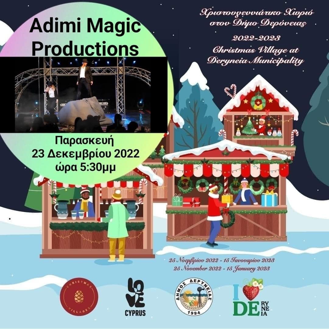 H Adimi Magic Productions στο Χριστουγεννιάτικο Χωριό του Δήμου Δερύνειας την Παρασκευή 23/12/22 ΩPA 17:30 για μια μαγική παράσταση που θα απολαύσουν για παιδιά και μεγάλοι.