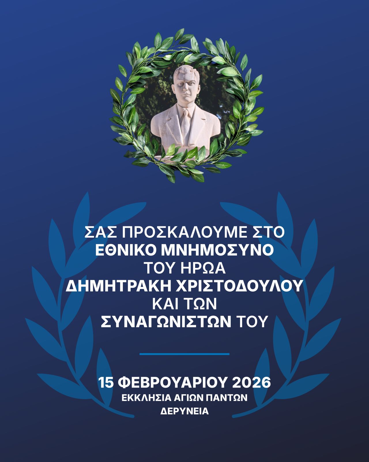 Το Εθνικό Μνημόσυνο Δημητράκη Χριστοδούλου και των συναγωνιστών του Στυλιανού Λένα και Σωτήρη Τσαγγάρη τελείται την Κυριακή 15/02/2026 στον Ι.Ν. Αγίων Πάντων στη Δερύνεια.