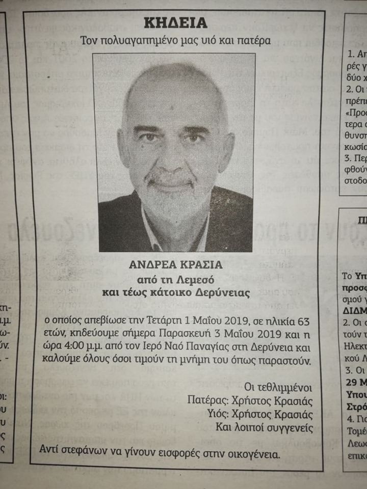 Η κηδεία θα γίνει σήμερα Παρασκευή, 03/05/19 και ώρα 16:00, στην εκκλησία των Αγίων Πάντων στη Δερύνεια.