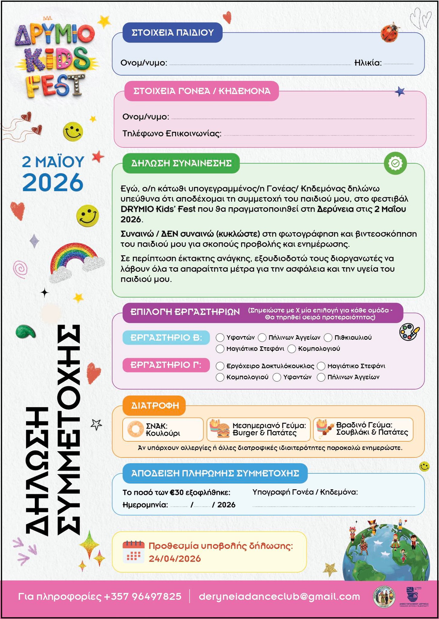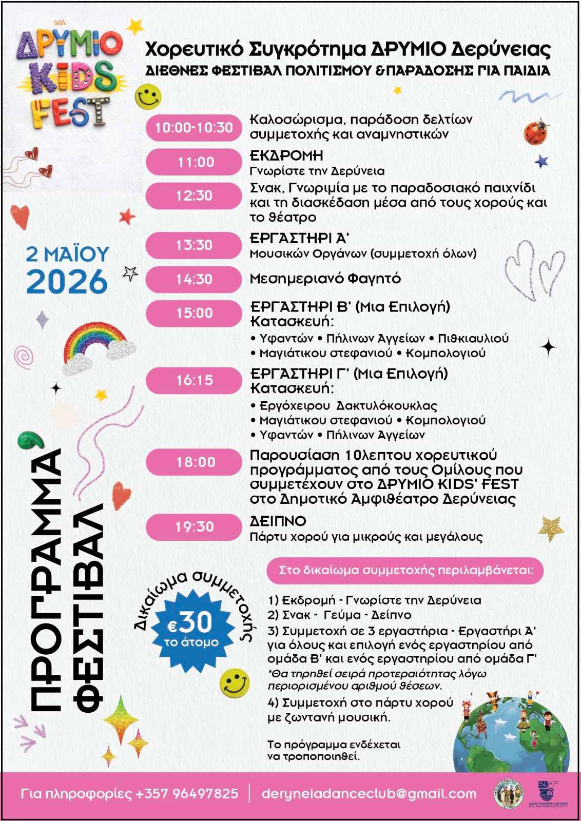 Σας προσκαλούμε στο Διεθνές Φεστιβάλ Πολιτισμού & Παράδοσης για Παιδιά, το Σάββατο 2 Μαΐου 2026, στο Πάρκο Δημοτικού Αμφιθεάτρου Δερύνειας.