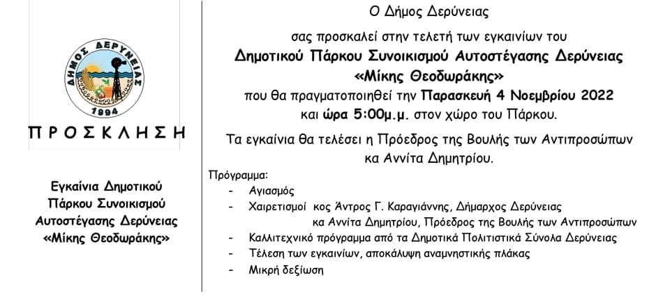 Ο Δήμος Δερύνειας προσκαλεί το κοινό στην τελετή των εγκαινίων του Δημοτικού Πάρκου Συνοικισμού Αυτοστέγασης Δερύνειας «Μίκης Θεοδωράκης» που θα πραγματοποιηθεί την Παρασκευή 4 Νοεμβρίου 2022 και ώρα 5:00μ.μ. στον χώρο του Πάρκου.