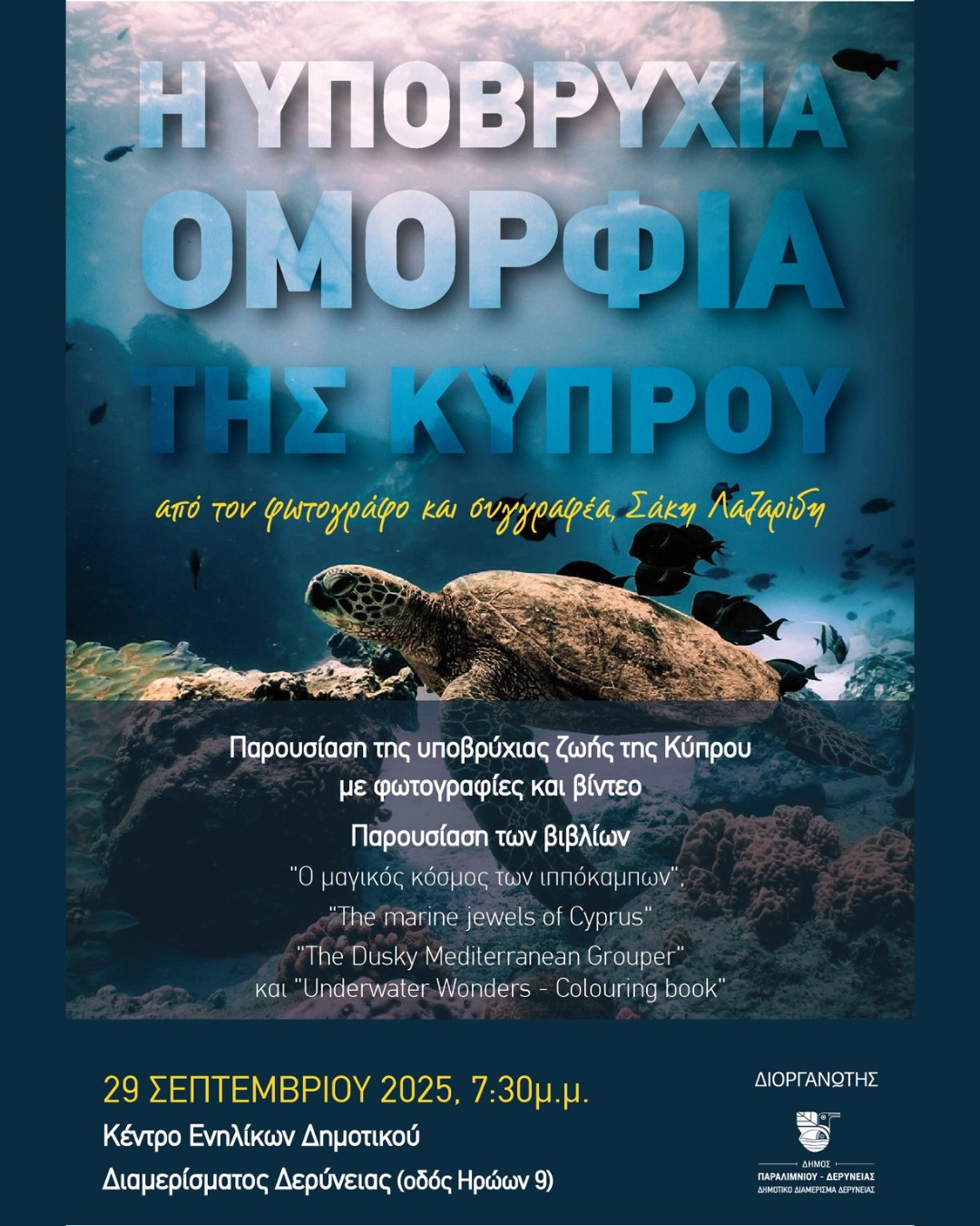 Η ΥΠΟΒΡΥΧΙΑ ΟΜΟΡΦΙΑ ΤΗΣ ΚΥΠΡΟΥ Από τον φωτογράφο και συγγραφέα Σάκη Λαζαρίδη την Δευτέρα 29 Σεπτεμβρίου 2025, 19:30 στο Κέντρο Ενηλίκων Δ.Δ. Δερύνειας