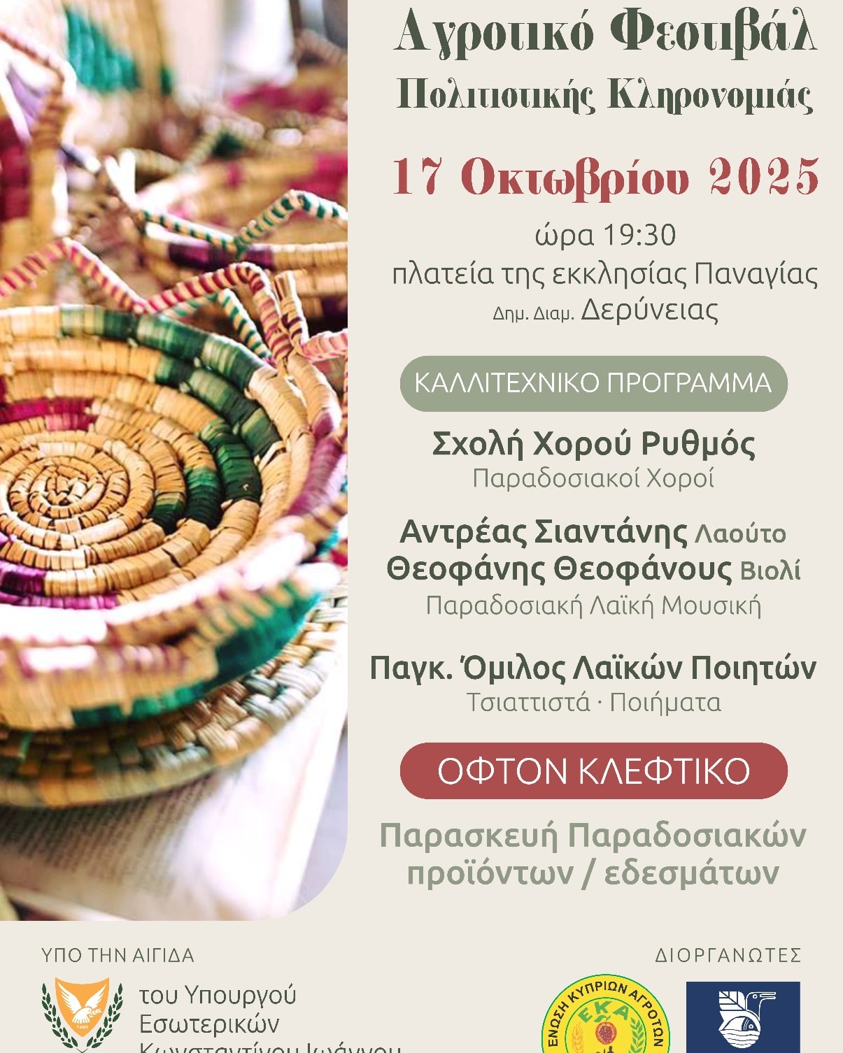 Το Αγροτικό Φεστιβάλ Πολιτιστικής Κληρονομιάς διοργανώνεται αύριο Παρασκευή, 17 Οκτωβρίου 2025 στην πλατεία εκκλησίας Παναγίας στη Δερύνεια.